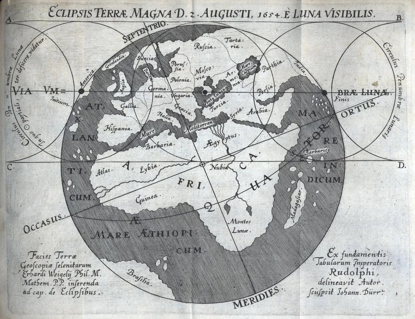 According to German historian of science Klaus-Dieter Herbst, this map of the total solar eclipse of August 12, 1654 was published by Erhard Weigel on the day before the eclipse!