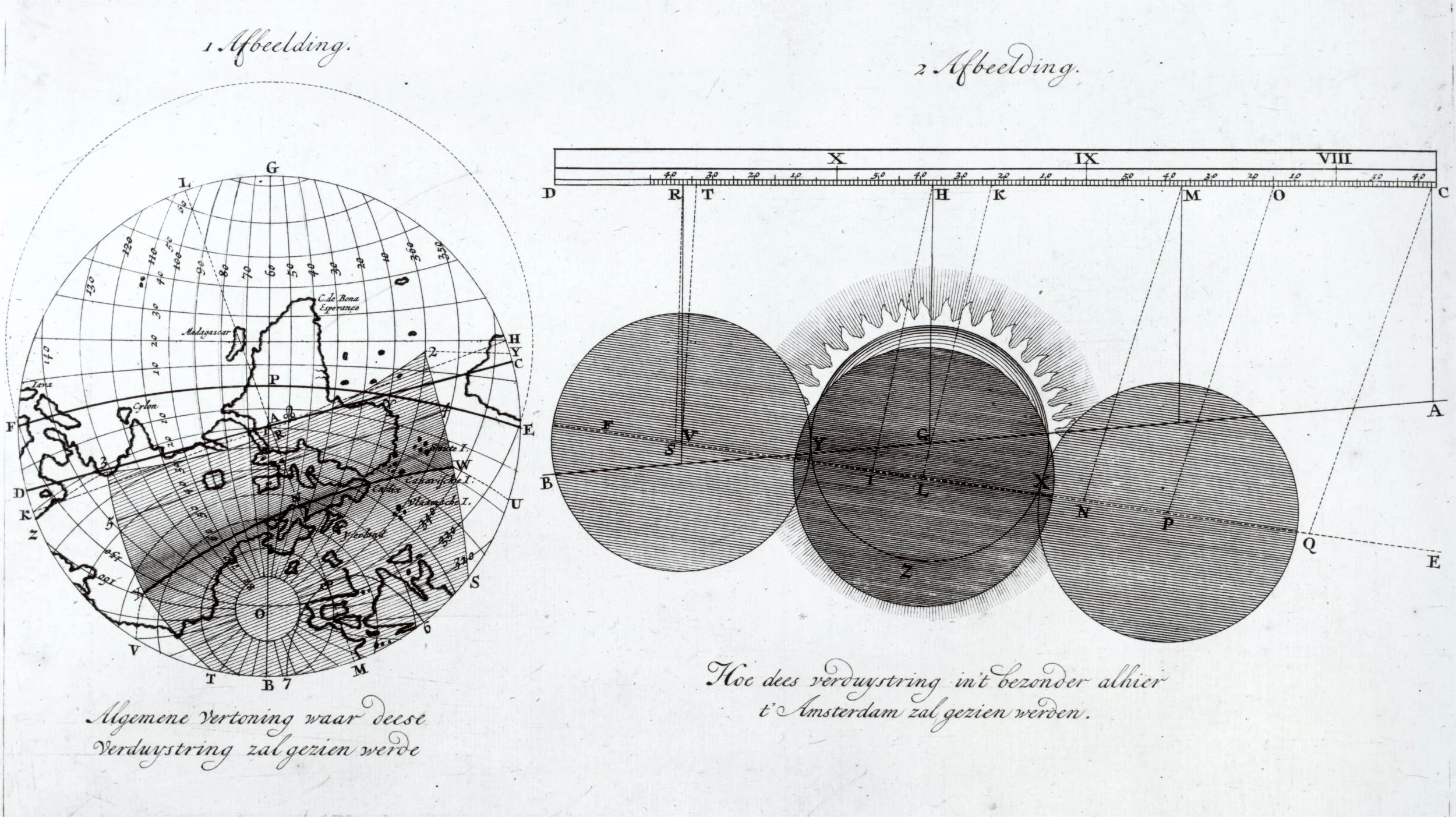 Andreas van Lugtenberg, a teacher of navigation at Rotterdam, published another eclipse map roughly showing the eclipse with two straight lines against a background of the world. This map shows North America with a curious appendage in the northwest.