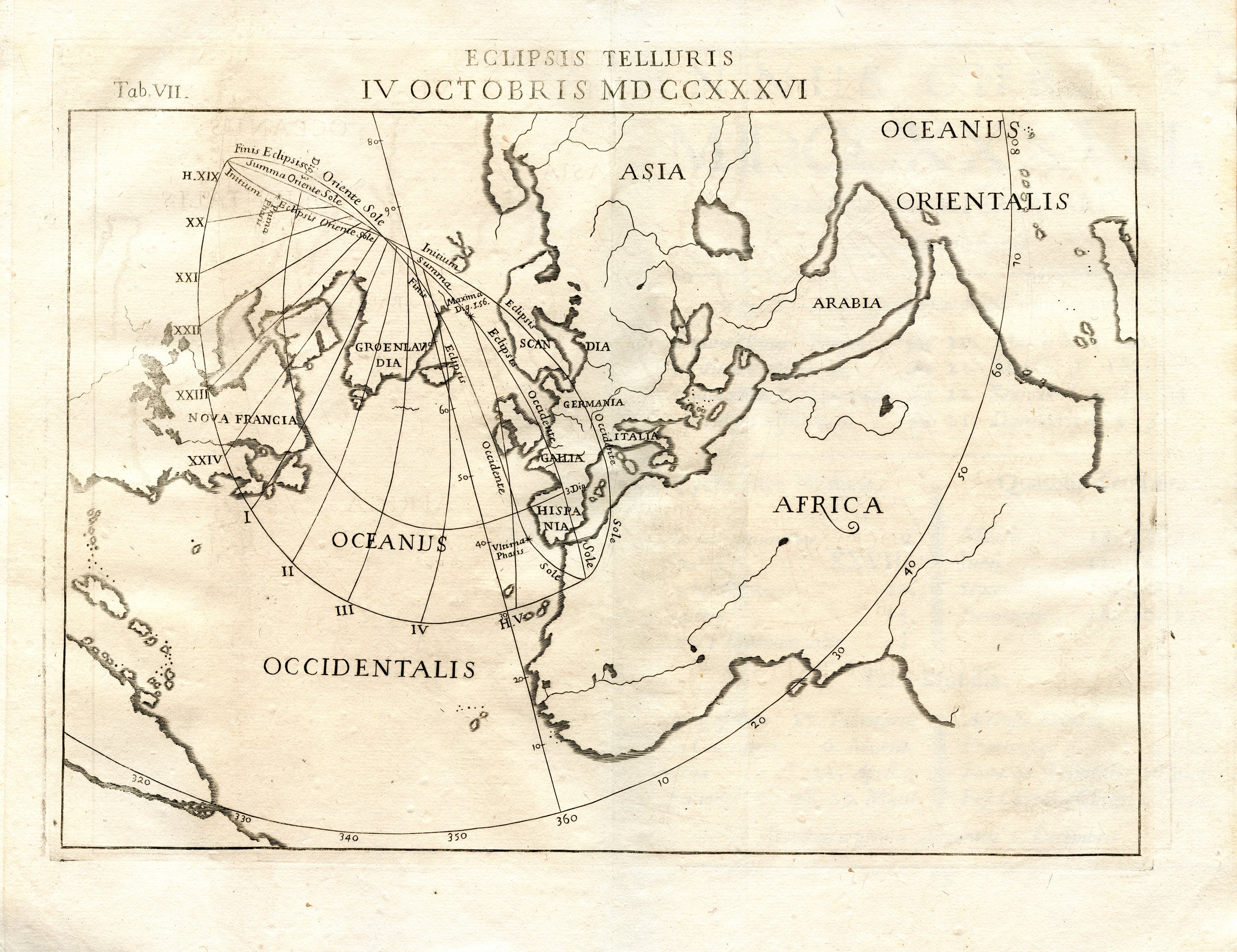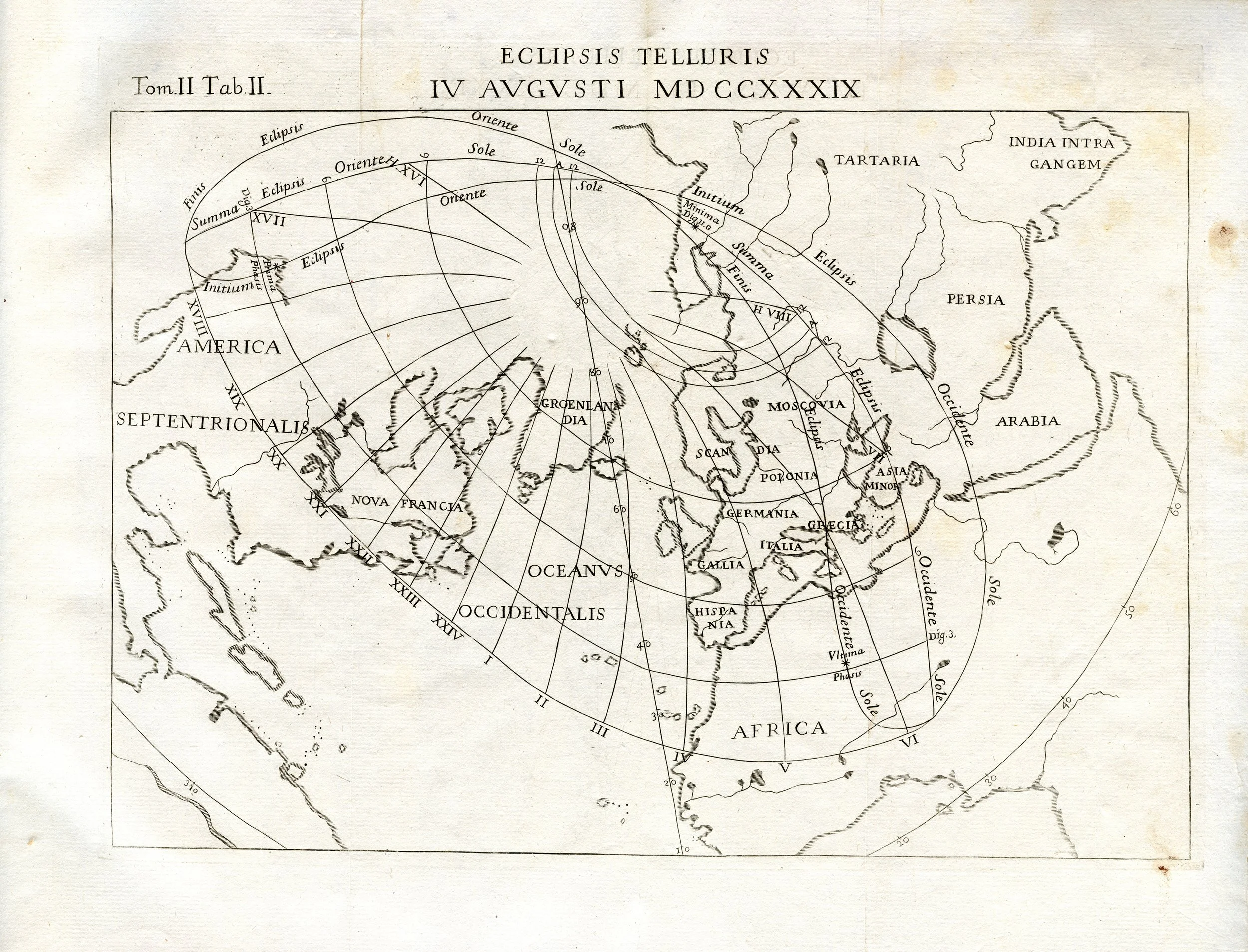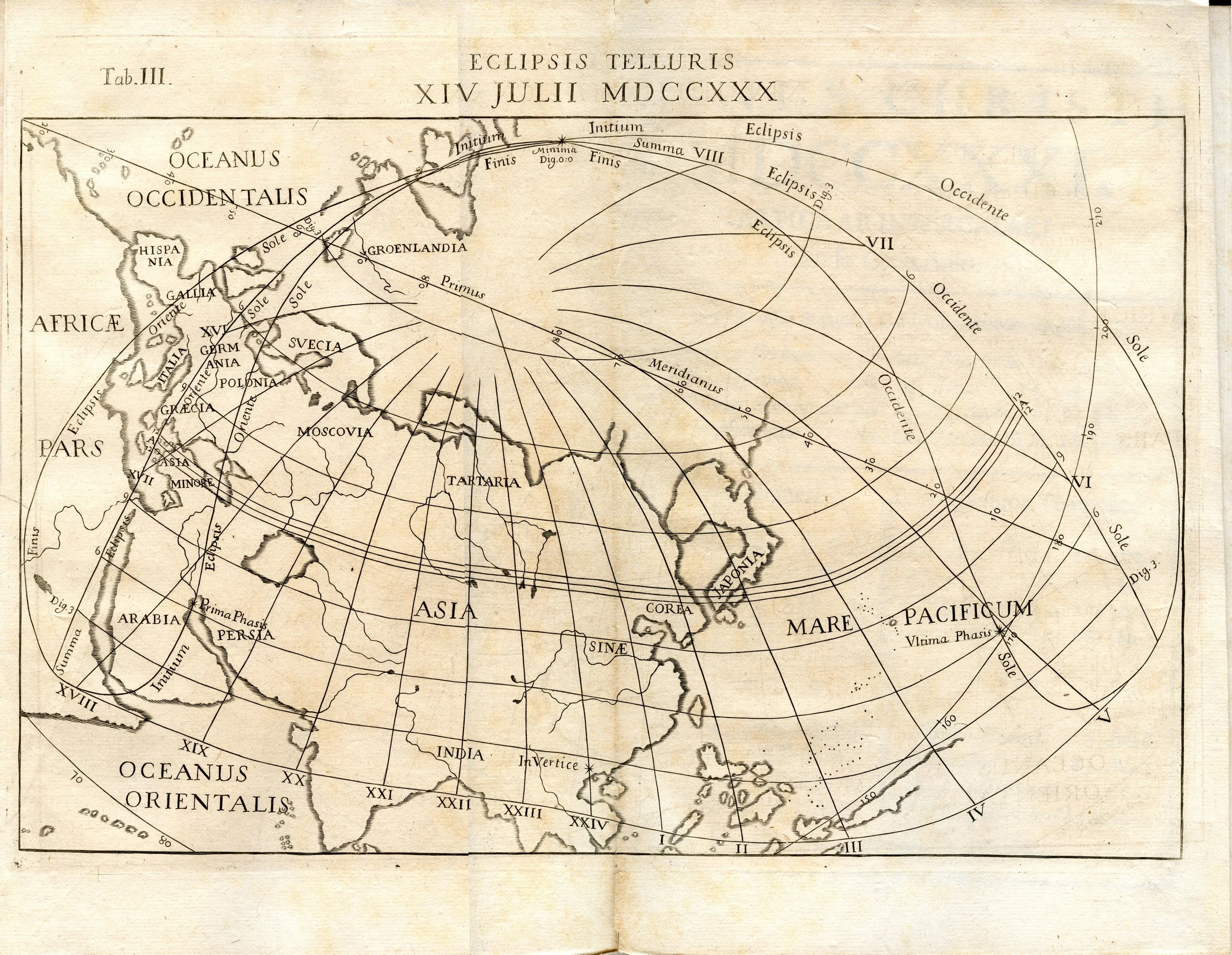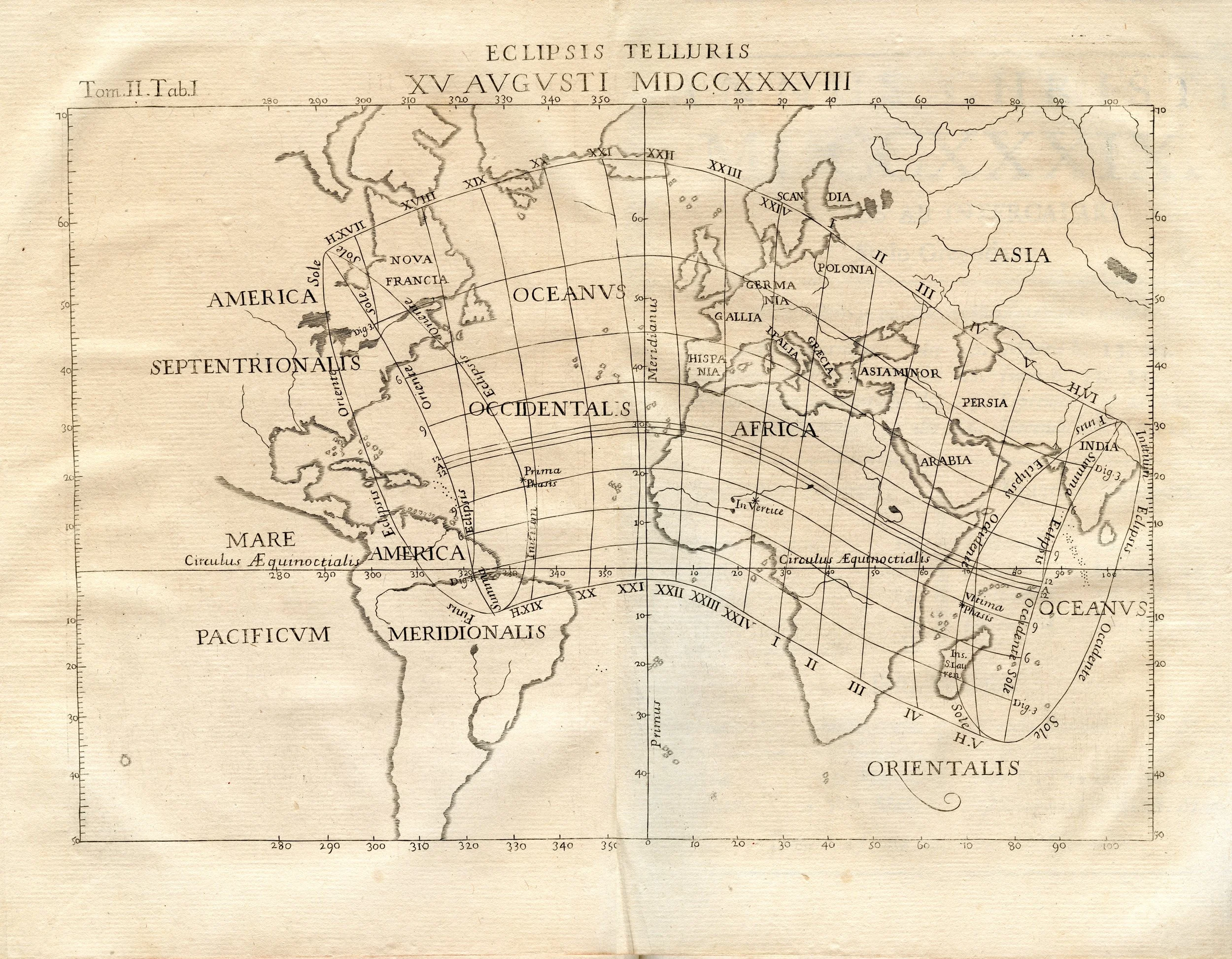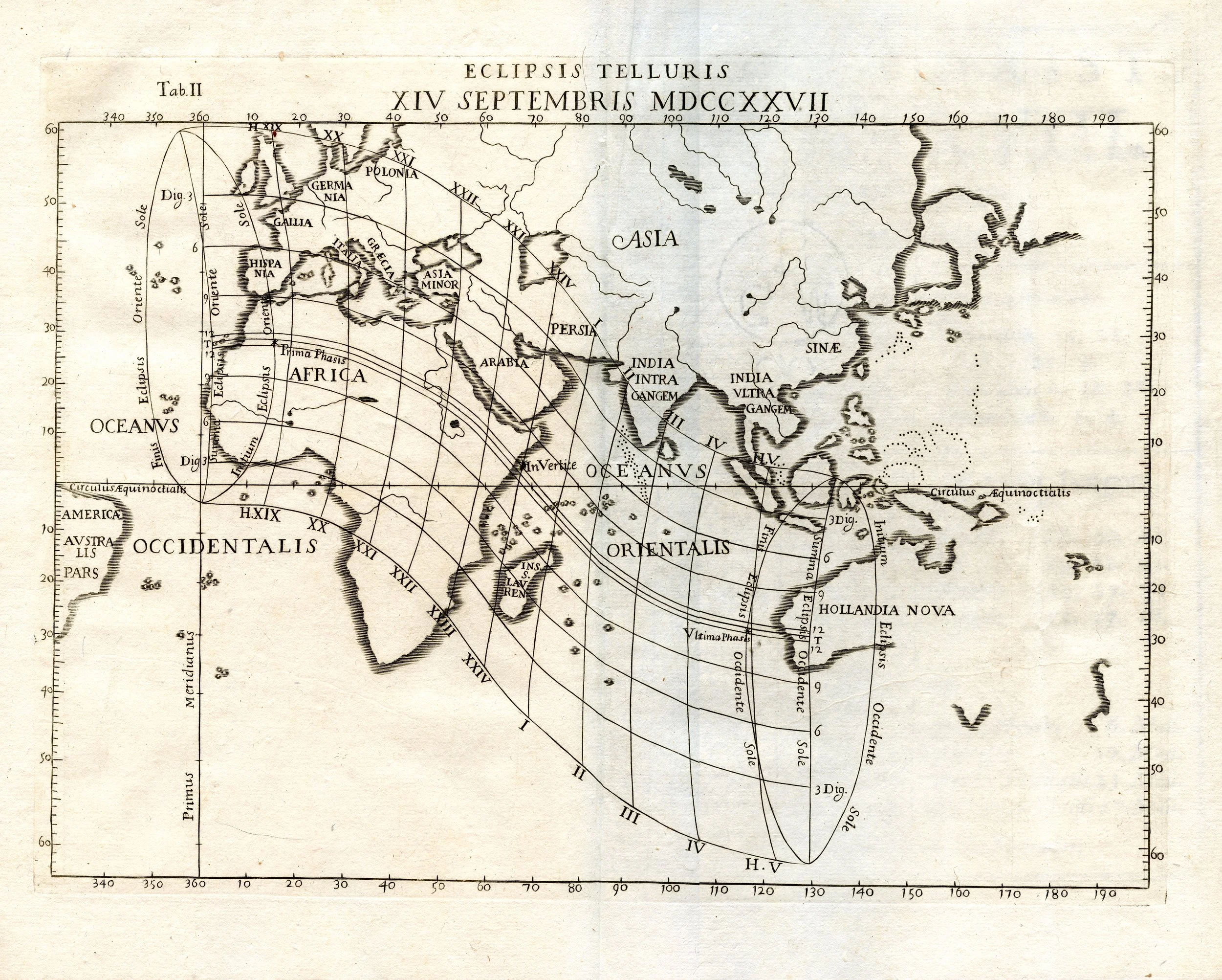 This eclipse map is the first to not include Europe. Note the incomplete and inaccurate shape of Nova Hollandia (Australia).