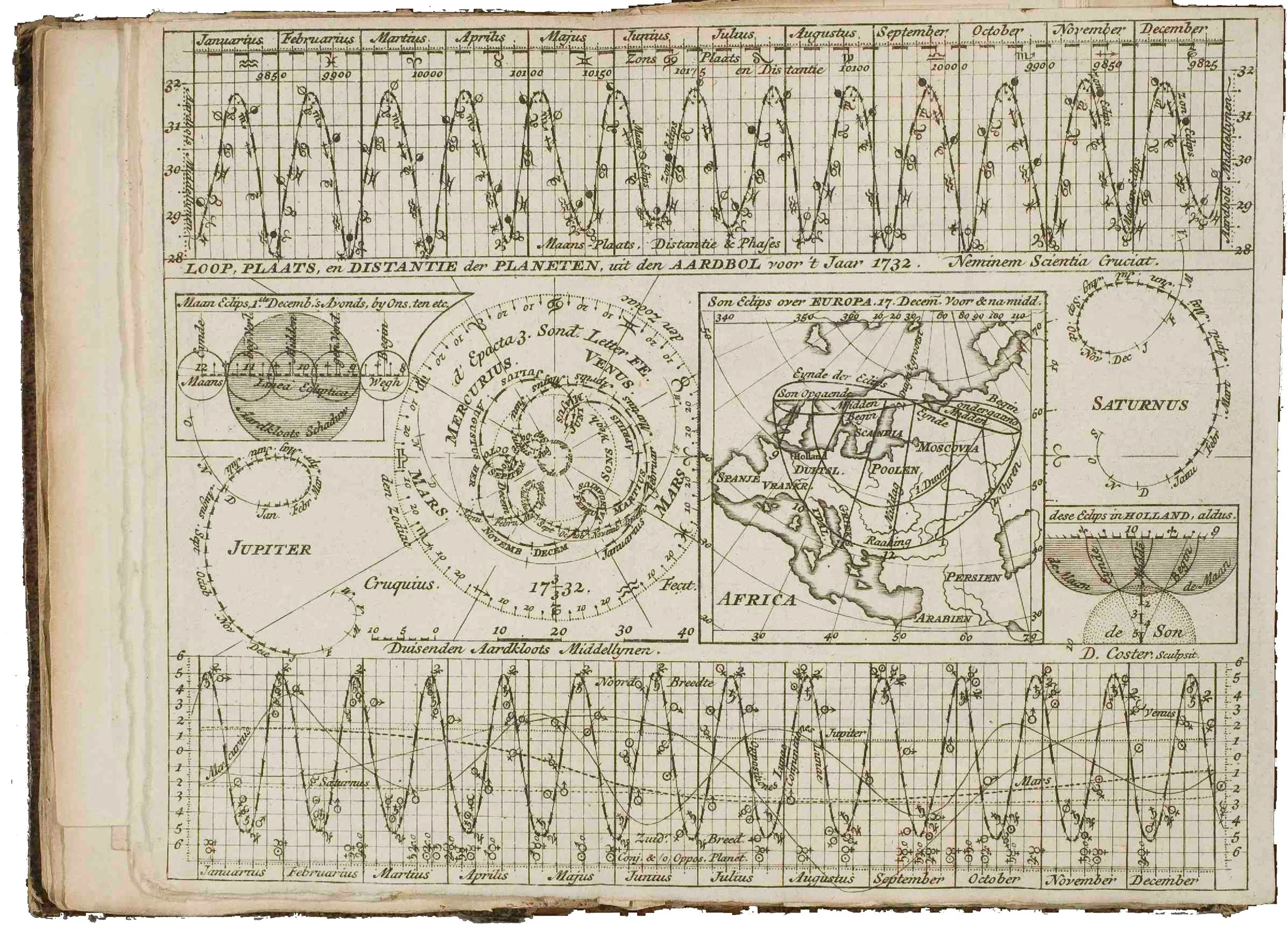 Title: Loop, plaats, en distantie der planeten, uit den aardbol voor ’t jaar 1732. Neminem scientia cruciat