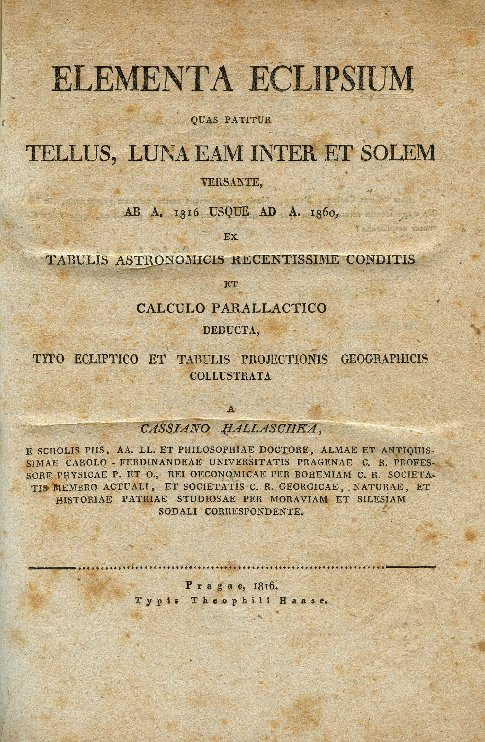 “One remarkable book - Elementa eclipsium ... - was published in Prague in the year 1816 by Franz Ignaz Cassian Hallaschka (1780 - 1847). It contained the maps for eclipses between 1816 and 1860 and was followed by a second volume with maps of eclipses until 1910 (Solc, 1999). The geometric constructions used by Hallaschka anticipated the standard theory of eclipses developed later by Friedrich Wilhelm Bessel. In the introductory chapter, most of contemporary European authors of eclipse calculations are listed - Du Sejour, Monteiro, Goudin, Delambre, Wolf, Mayer and other authors of eclipse papers like Euler, Lalande, T. Mayer, Lagrange, Lexell, Cagnoli, Gerstner, Kluegel and Bohnenberger. However, Hallaschka developed his own method determining the umbral size and position according to the work of Cl. Wurm and geometric projections on the Earth’s surface were based on the books by Lalande and Rüdinger.”