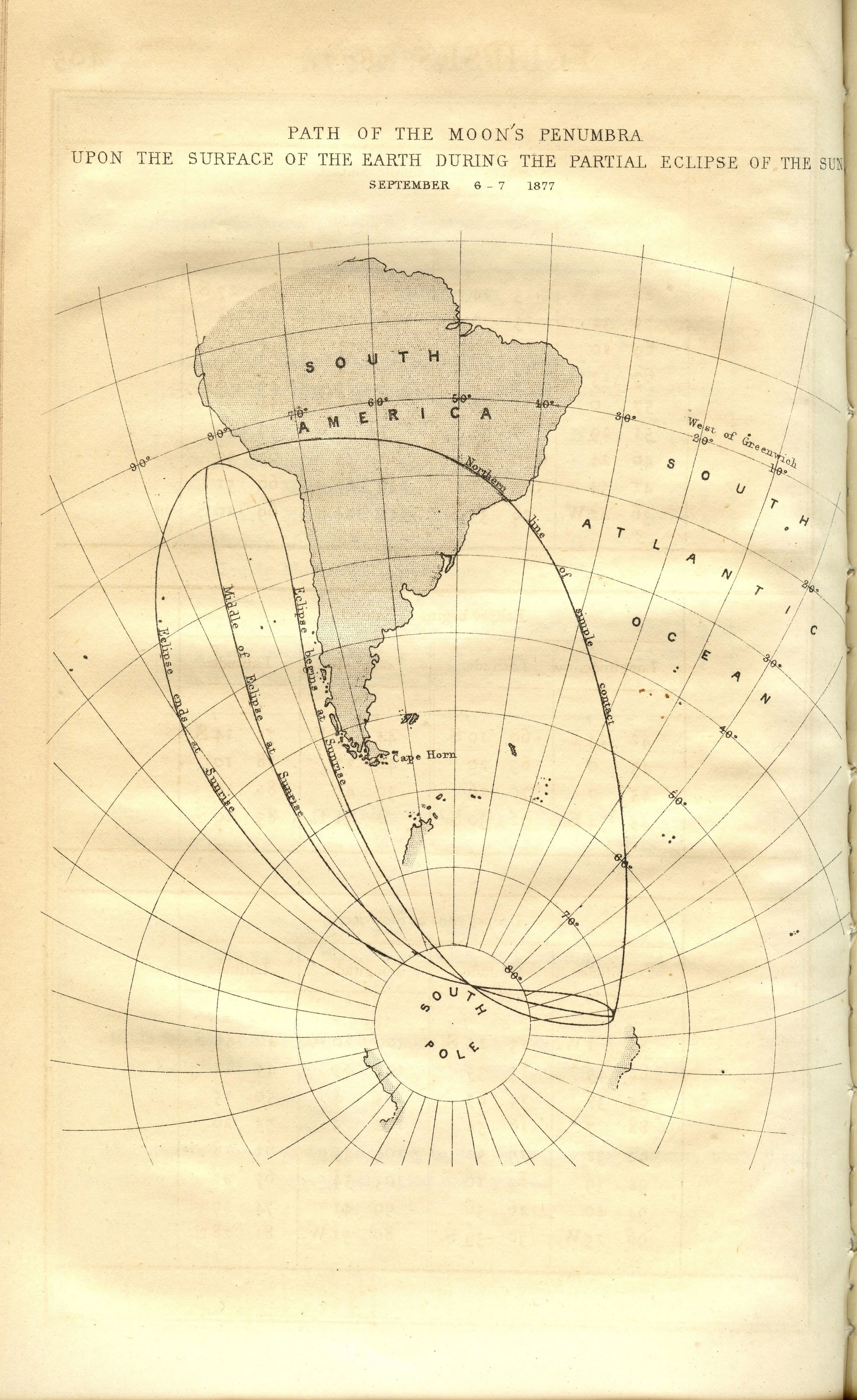 The Nautical Almanac and Astronomical Ephemeris Path of the Moon’s Penumbra upon the Surface of the Earth during the Partial Eclipse of the Sun, September 6-7, 1877. Scanned at Federal Repository Library, UC Berkeley