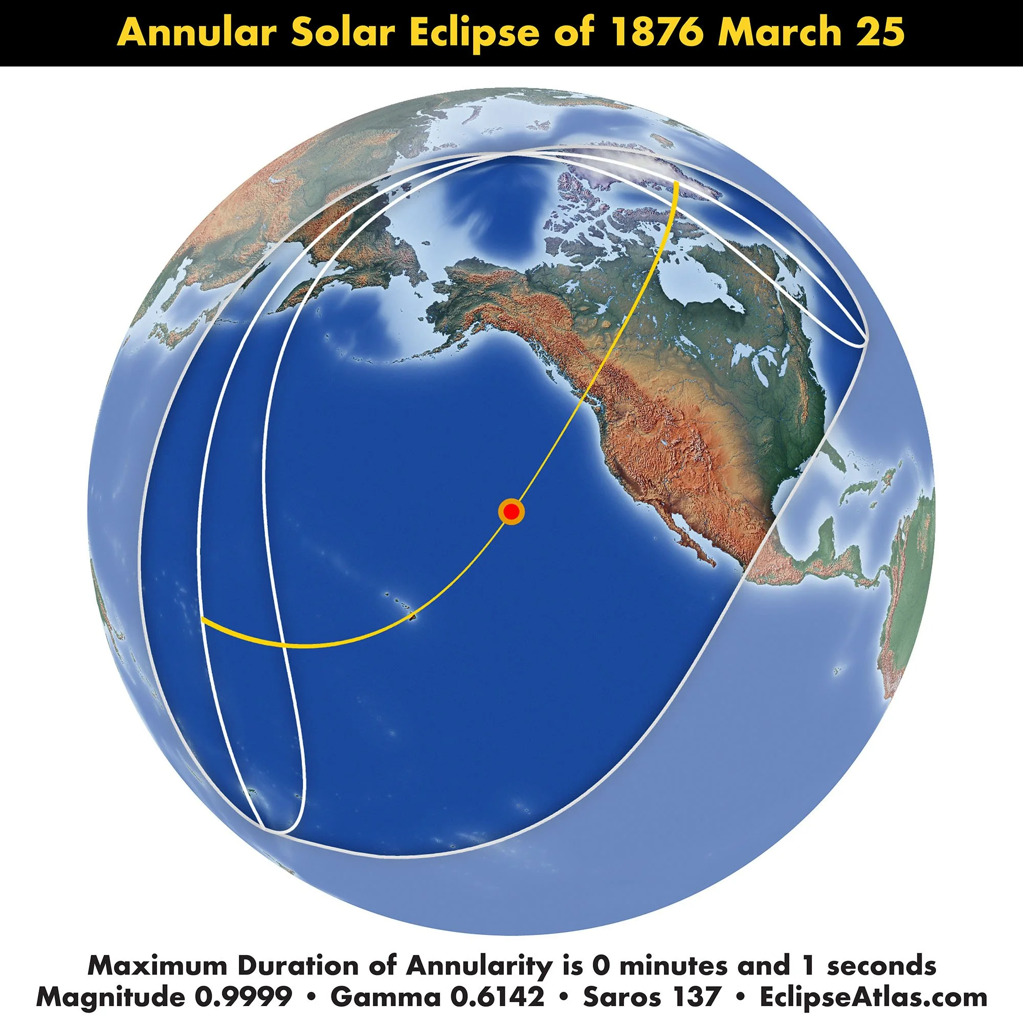 American Ephemeris and Nautical Almanac Outlines and Path of the Penumbra and the Central Line of the Annular Eclipse of March 25, 1876. Scanned at Federal Repository Library, UC Berkeley