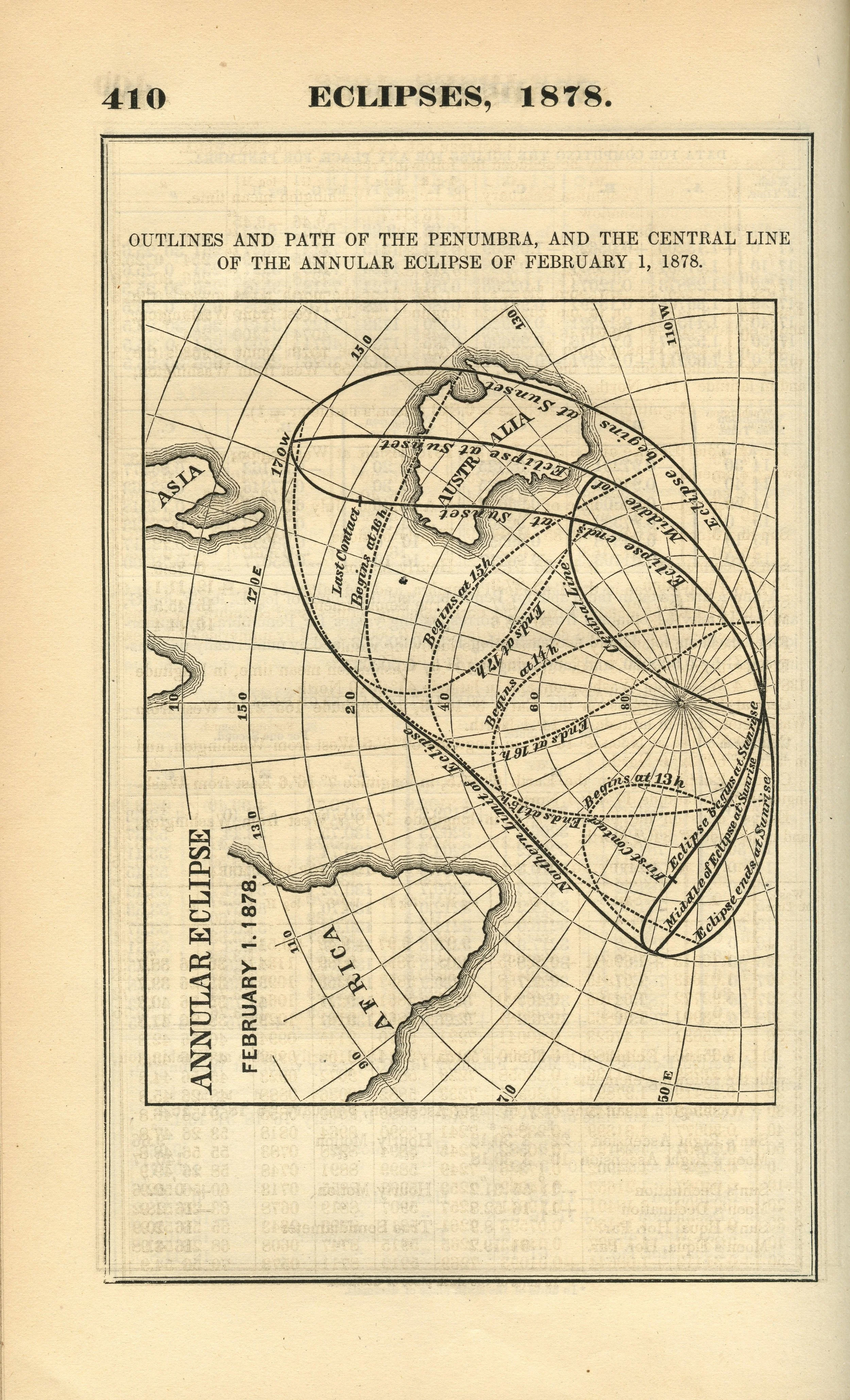 American Ephemeris and Nautical Almanac Outlines and Path of the Penumbra, and the Central Line of the Annular Eclipse of February 1, 1878. Scanned at Federal Repository Library, UC Berkeley