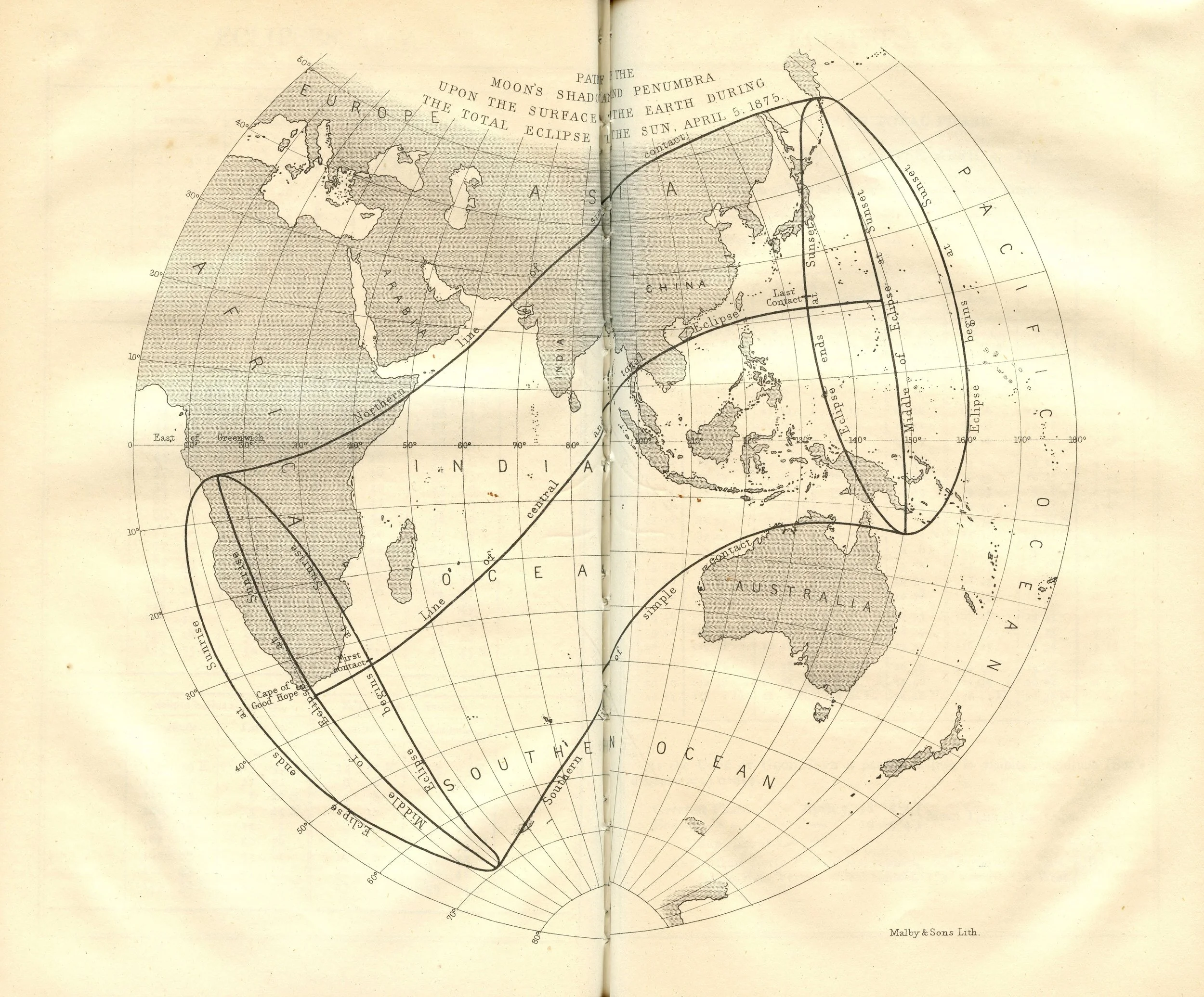 The Nautical Almanac and Astronomical Ephemeris Path of the Moon’s Shadow and Penumbra upon the Surface of the Earth during the Partial Eclipse of the Sun, April 5, 1875. Scanned at Federal Repository Library, UC Berkeley