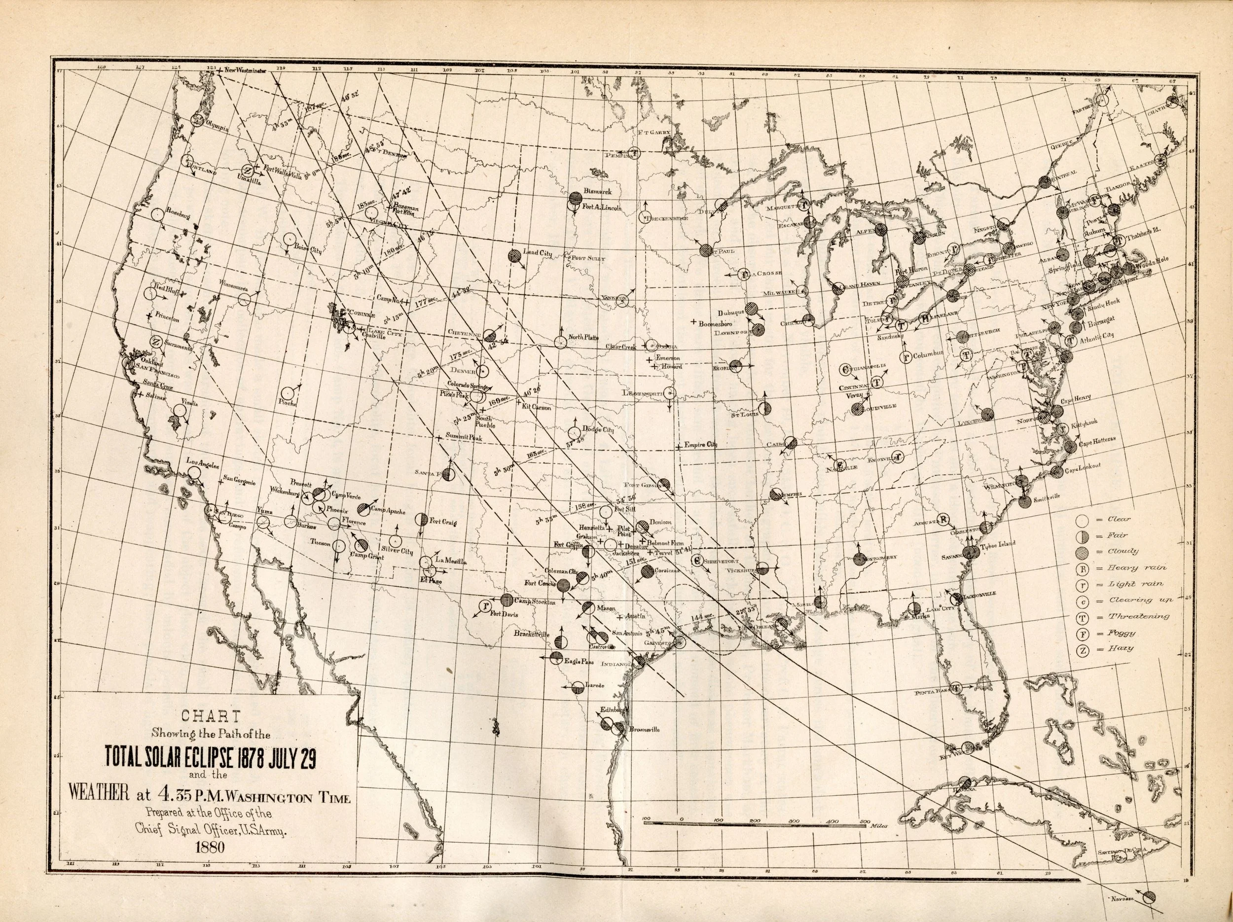 Office of the Chief Signal Officer, U.S. Army Cart showing the Path of the Total Solar Eclipse 1878 July 29 and Weather at 4:35 P.M. Washington Time Scanned at USNO James Melville Gillis Library