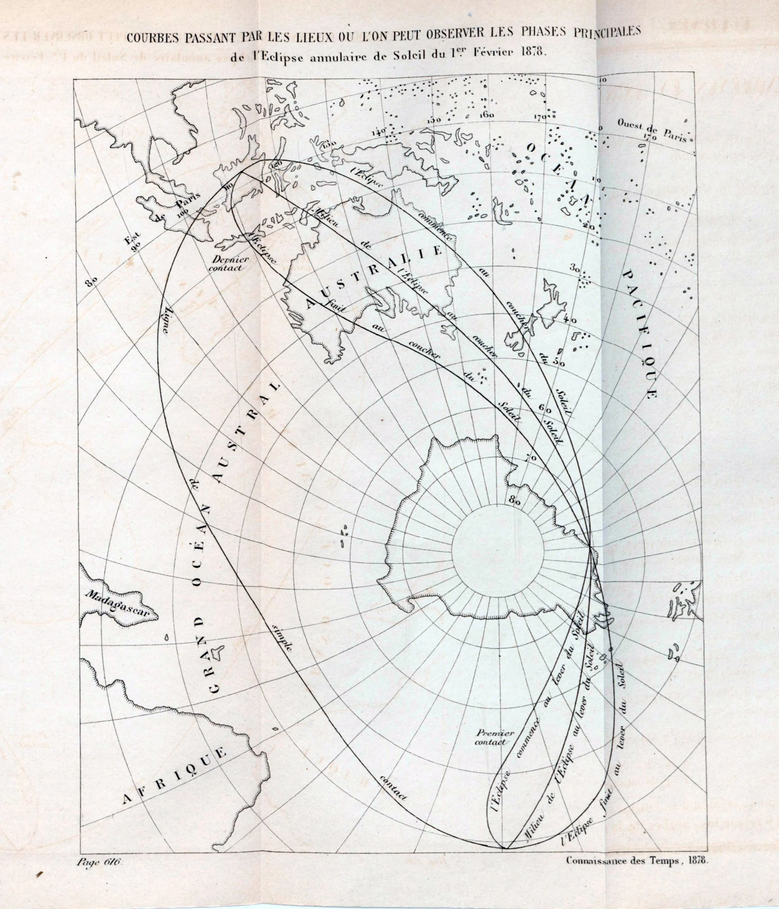 Connaissance des Temps Courbes Passant par les Lieux ou l’on Observer les phases principales de l’Eclipse annulaire de Soleil du 1er Fevrier 1878. gallica.bnf.fr