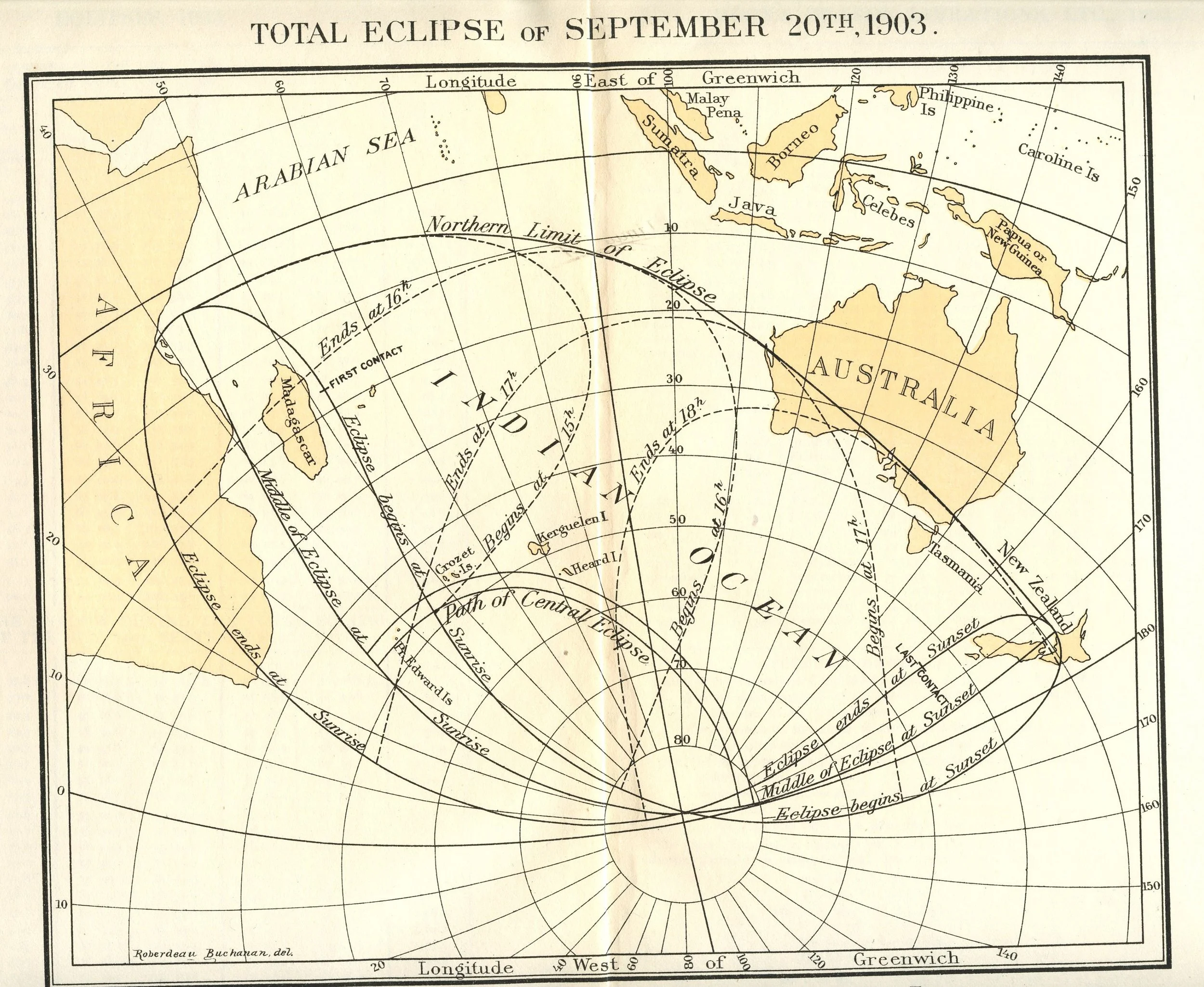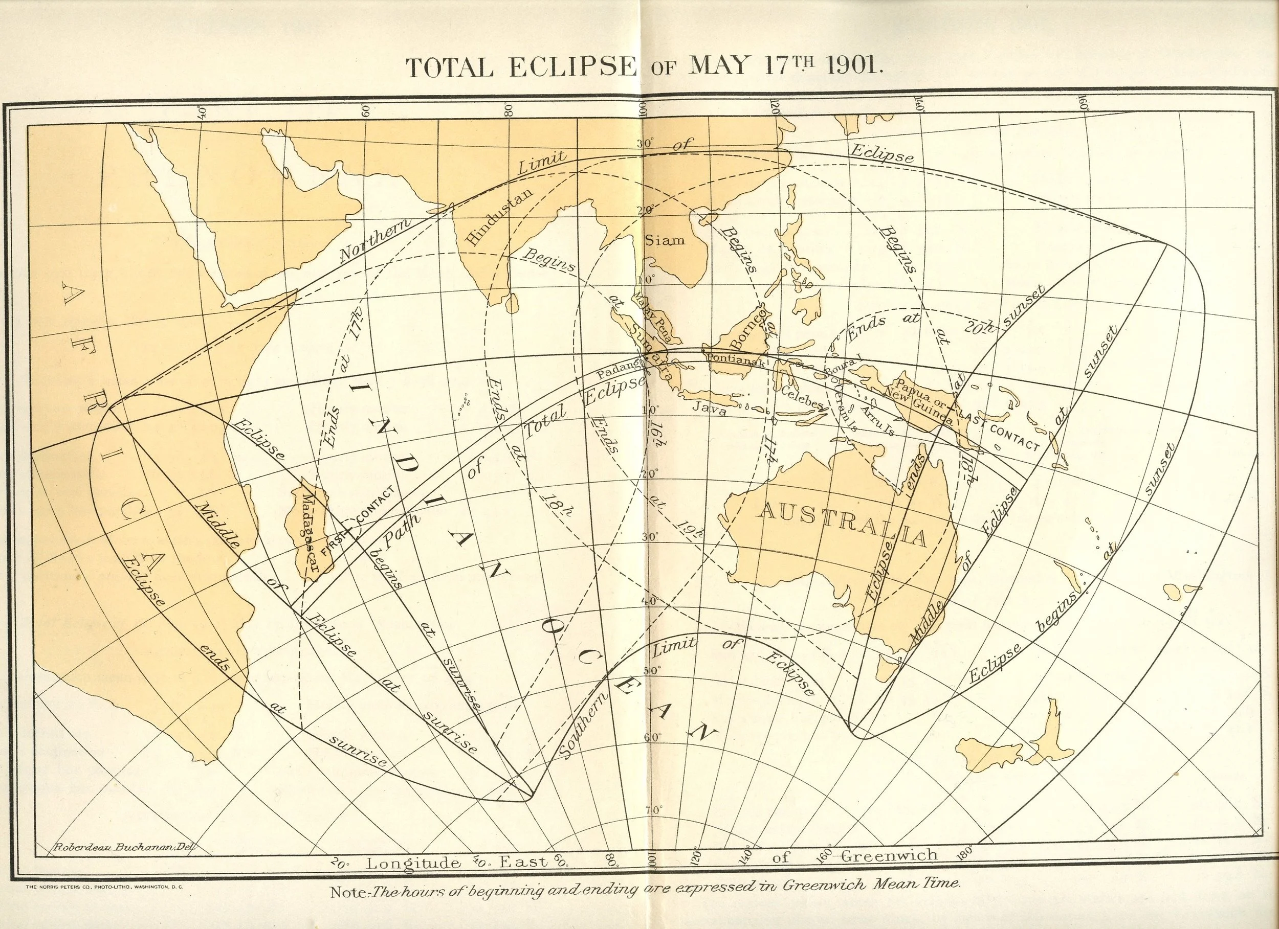 Nautical Almanac Circular Eastern Portion of Path of the Moon's Shadow During the Total Solar Eclipse of May 17-18, 1901. Courtesy of Sheridan Williams