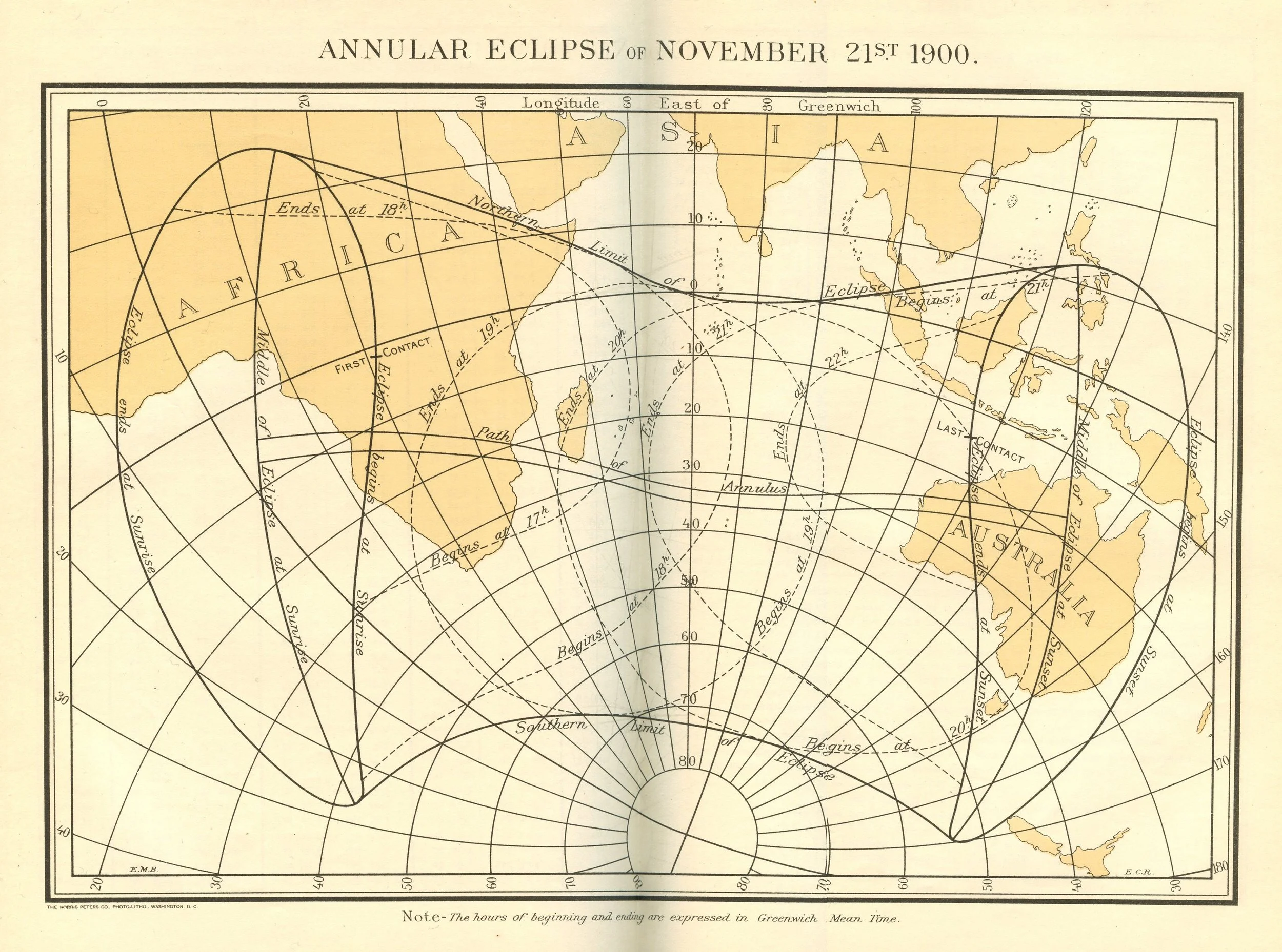 Nautical Almanac and Astronomical Ephemeris Path of the Moon's Penumbra upon the Surface of the Earth During the Annular Eclipse of the Sun November 21, 1900. Collection of Michael Zeiler