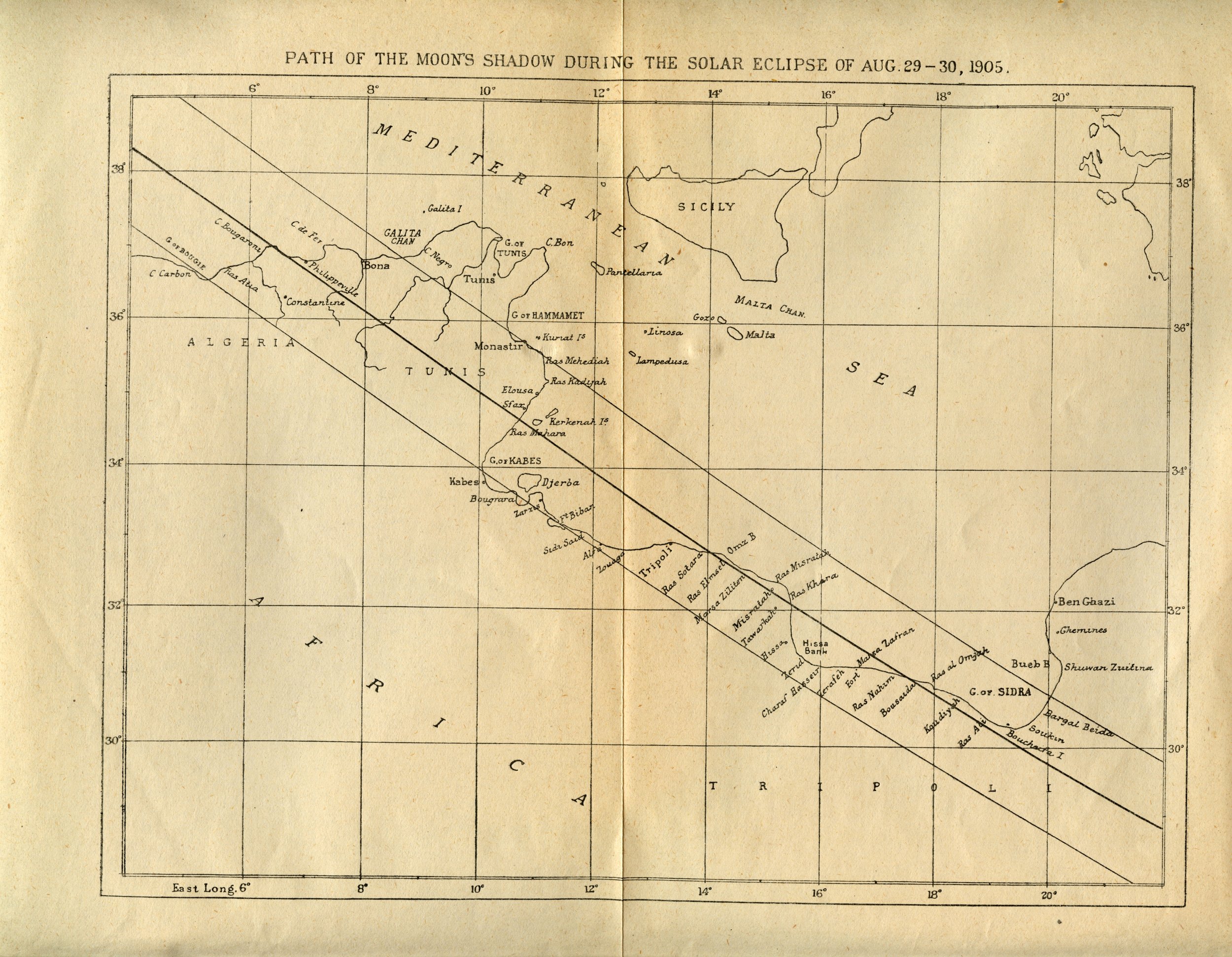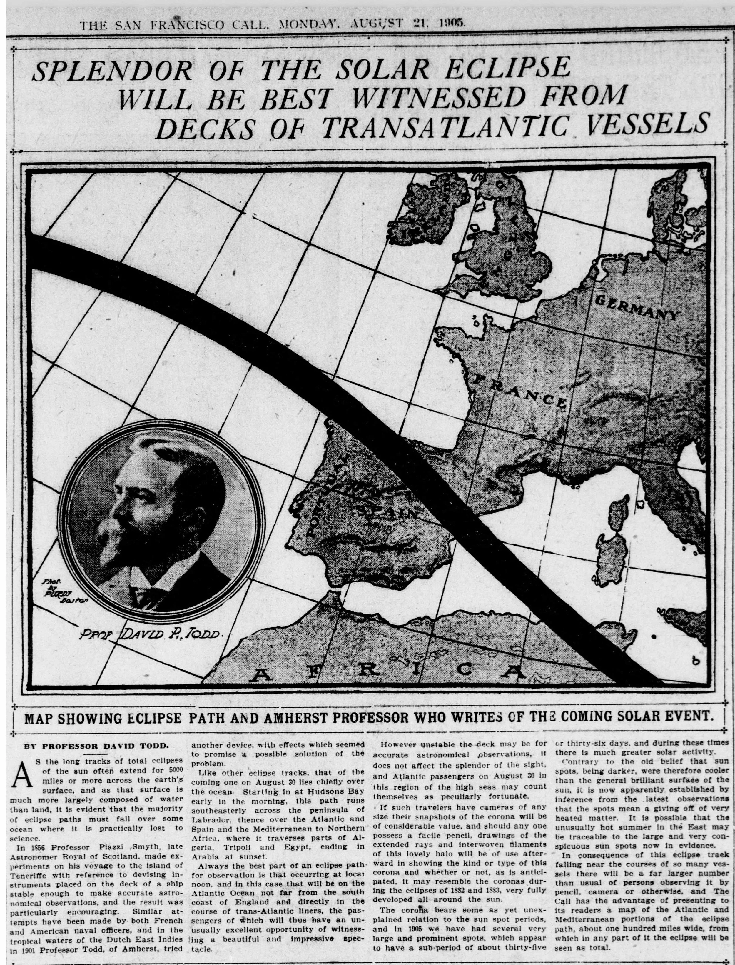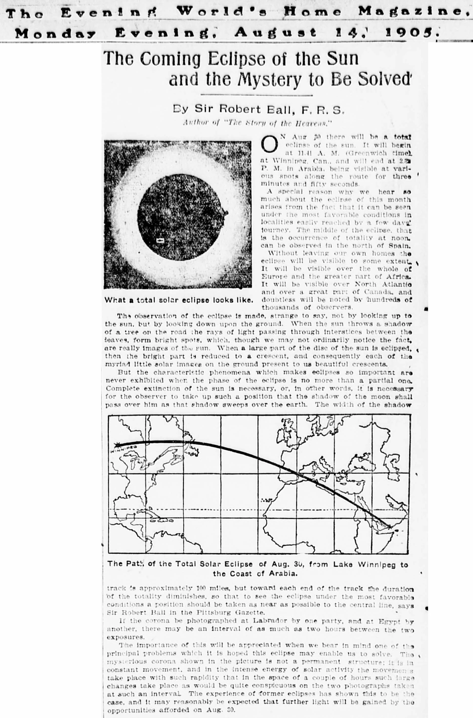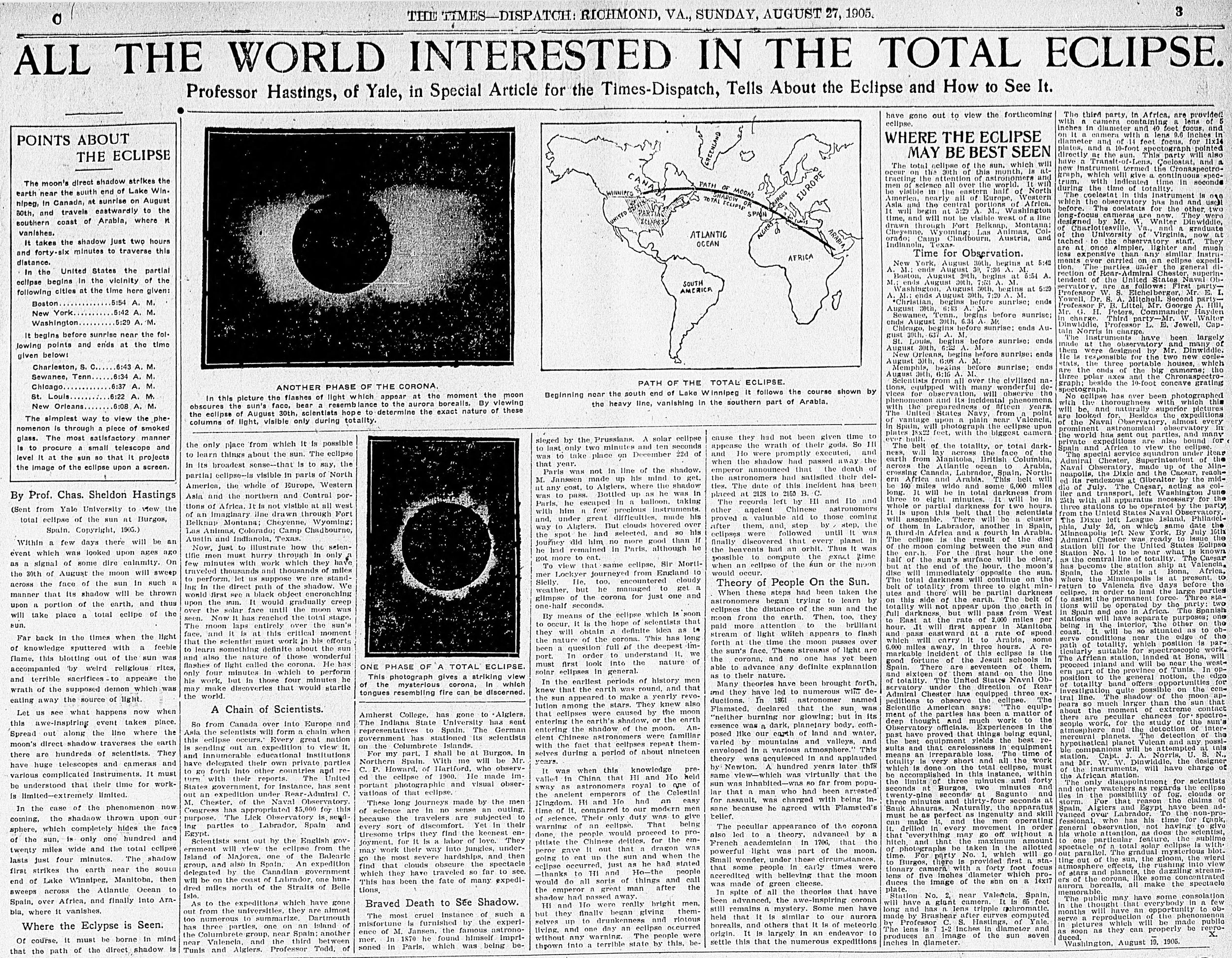 The total solar eclipse of August 30, 1905 crossed Canada, Spain, Algeria, Tunisia, Libya, Egypt, Saudi Arabia, and Yemen. Numerous eclipse expeditions were sent by the British Astronomical Association, United States Naval Observatory, and other institutions as well as many eclipse tourists from Europe.