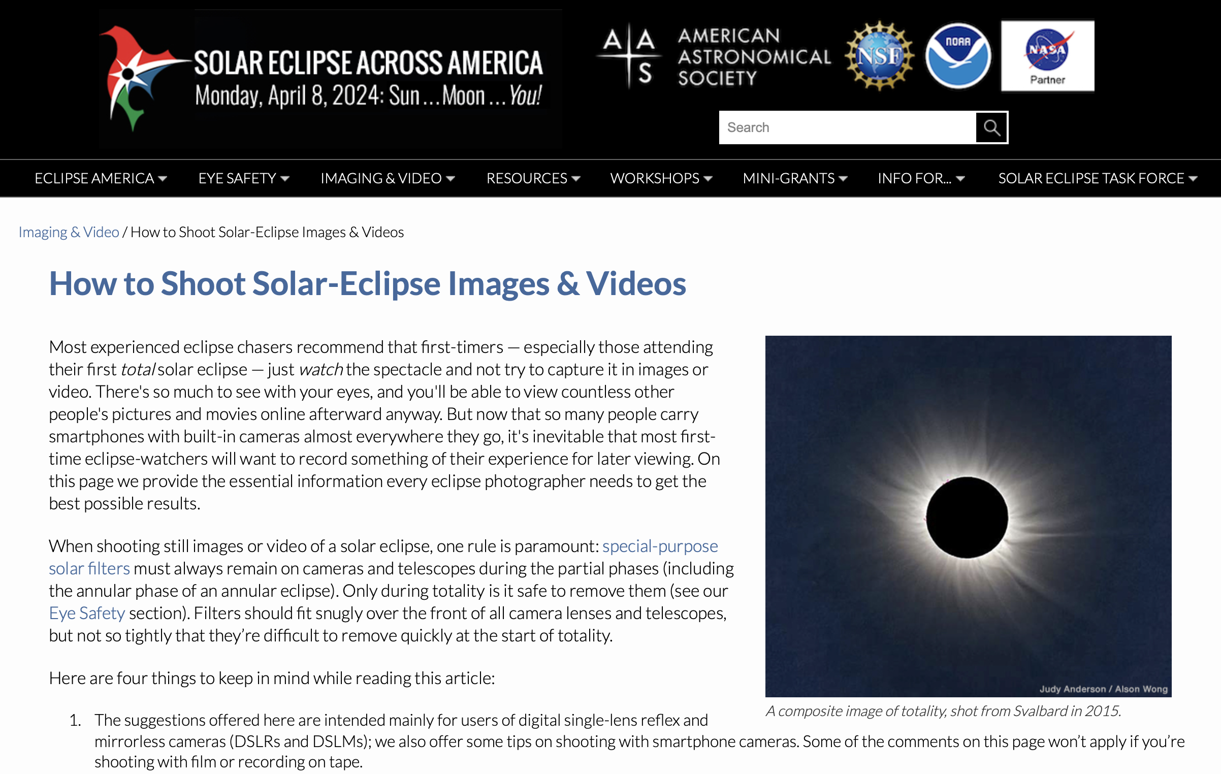 eclipse.aas.org Eclipse information from the American Astronomical Society. While much of the information is for the 2024 eclipse, there is also great general content