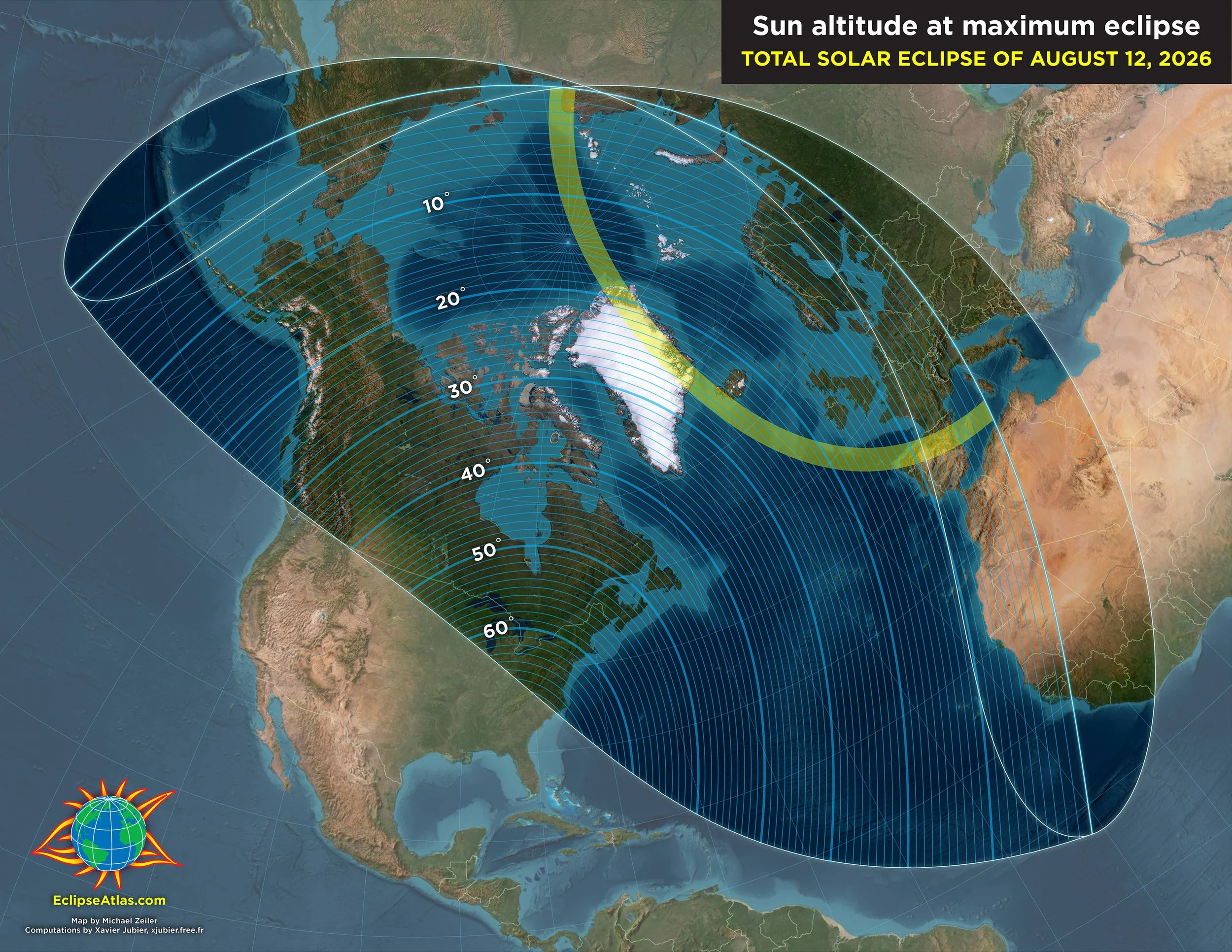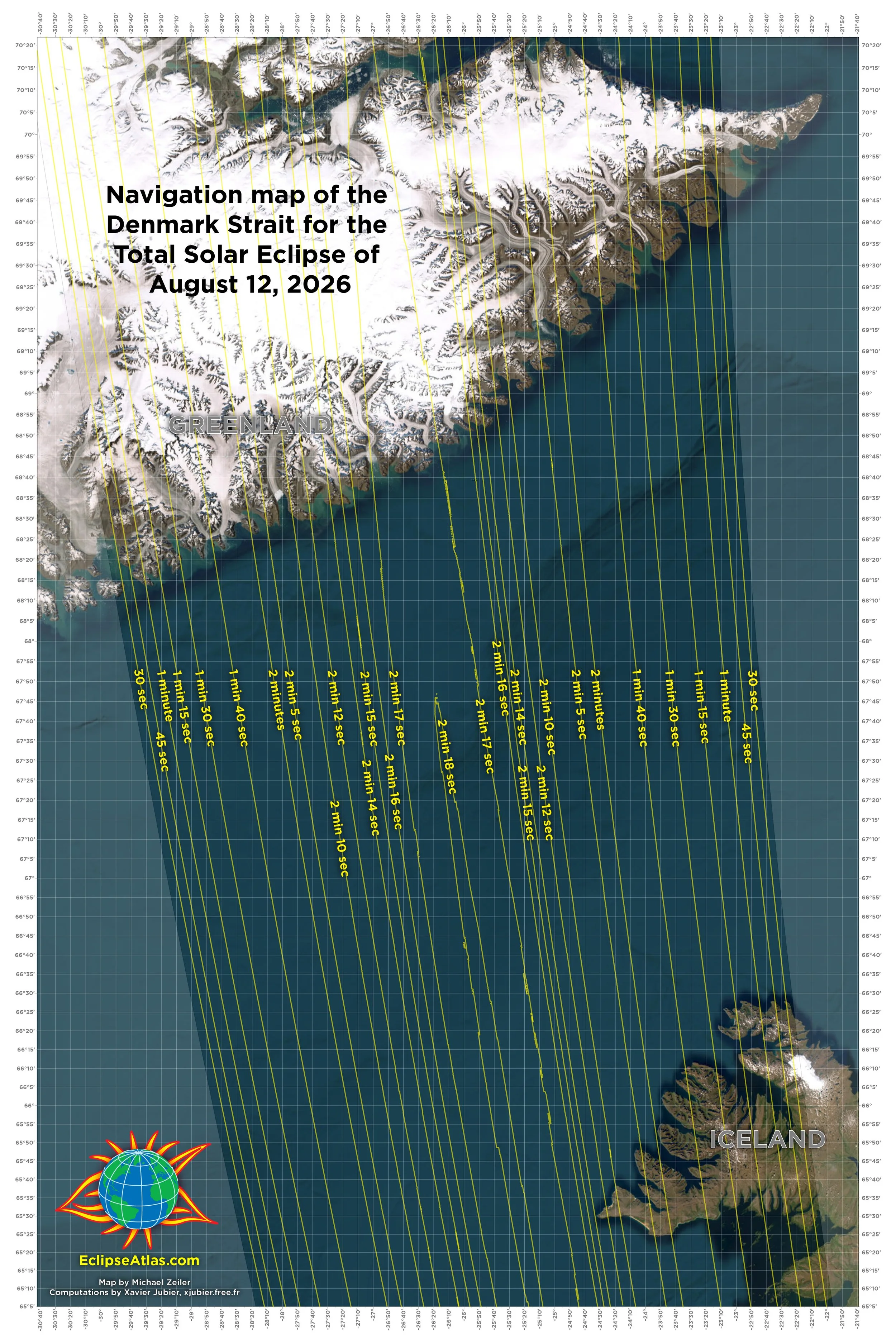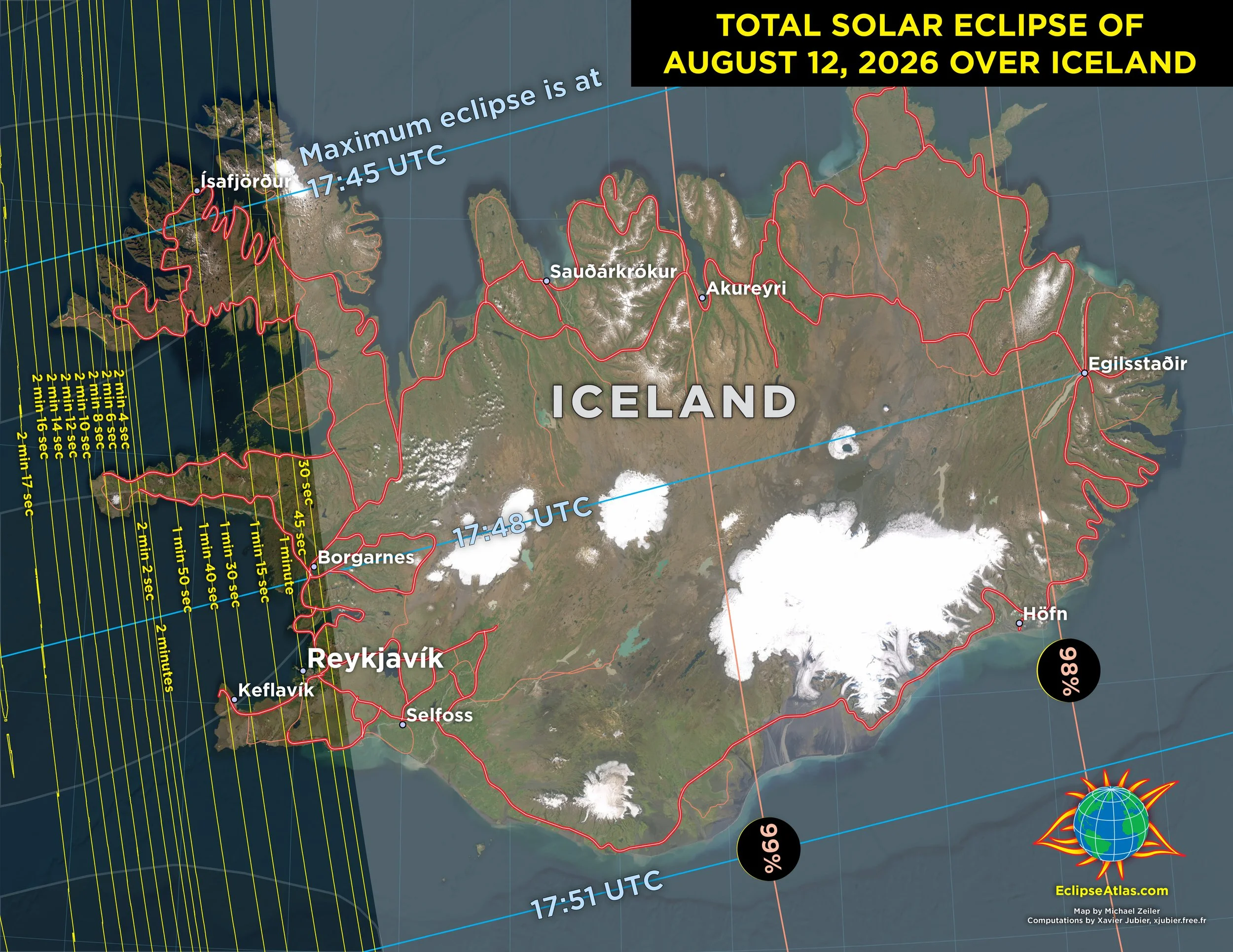 Overview map of the eclipse over Iceland From the Atlas of Solar Eclipses - 2020 to 2045 by Michael Zeiler and Michael Bakich