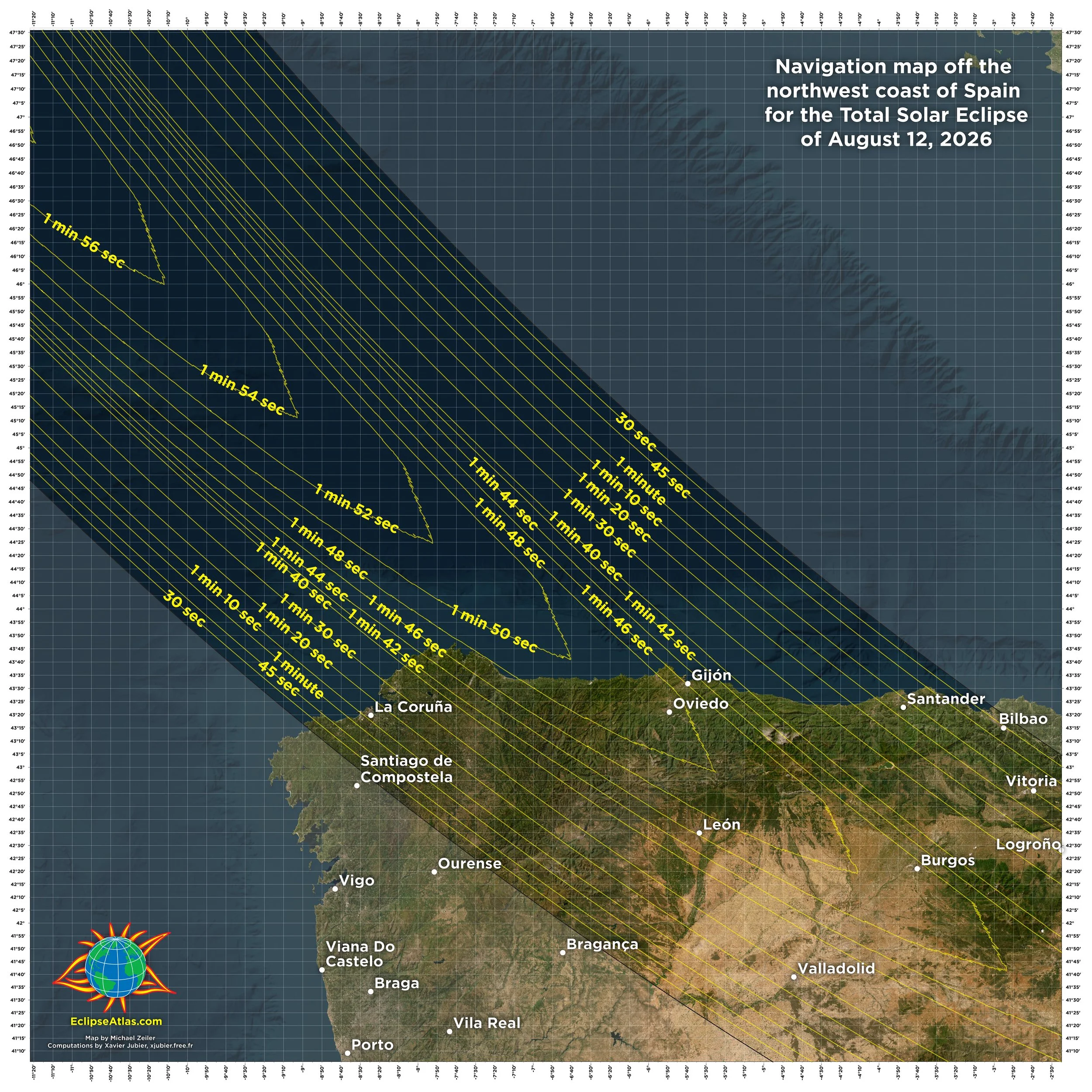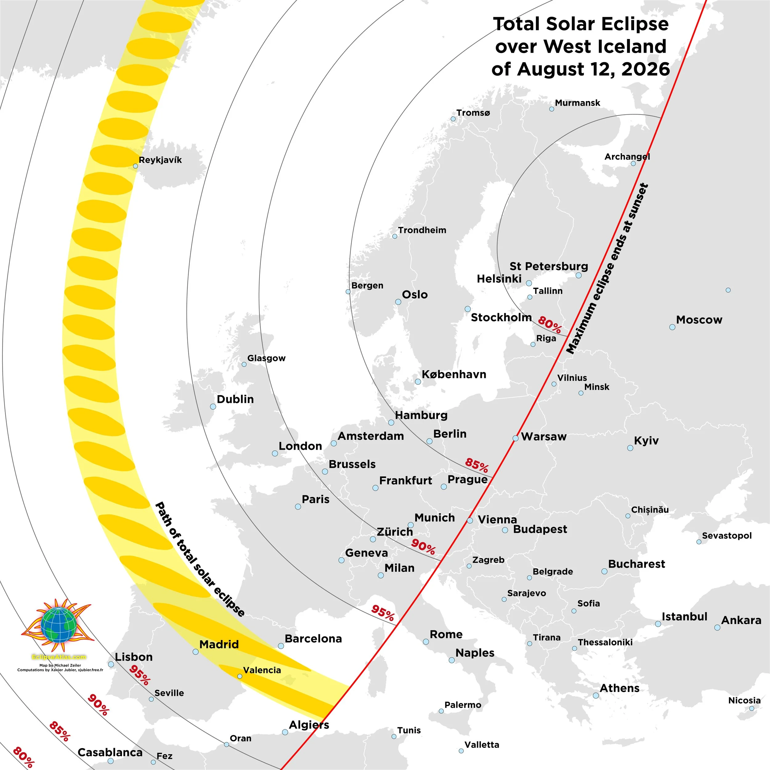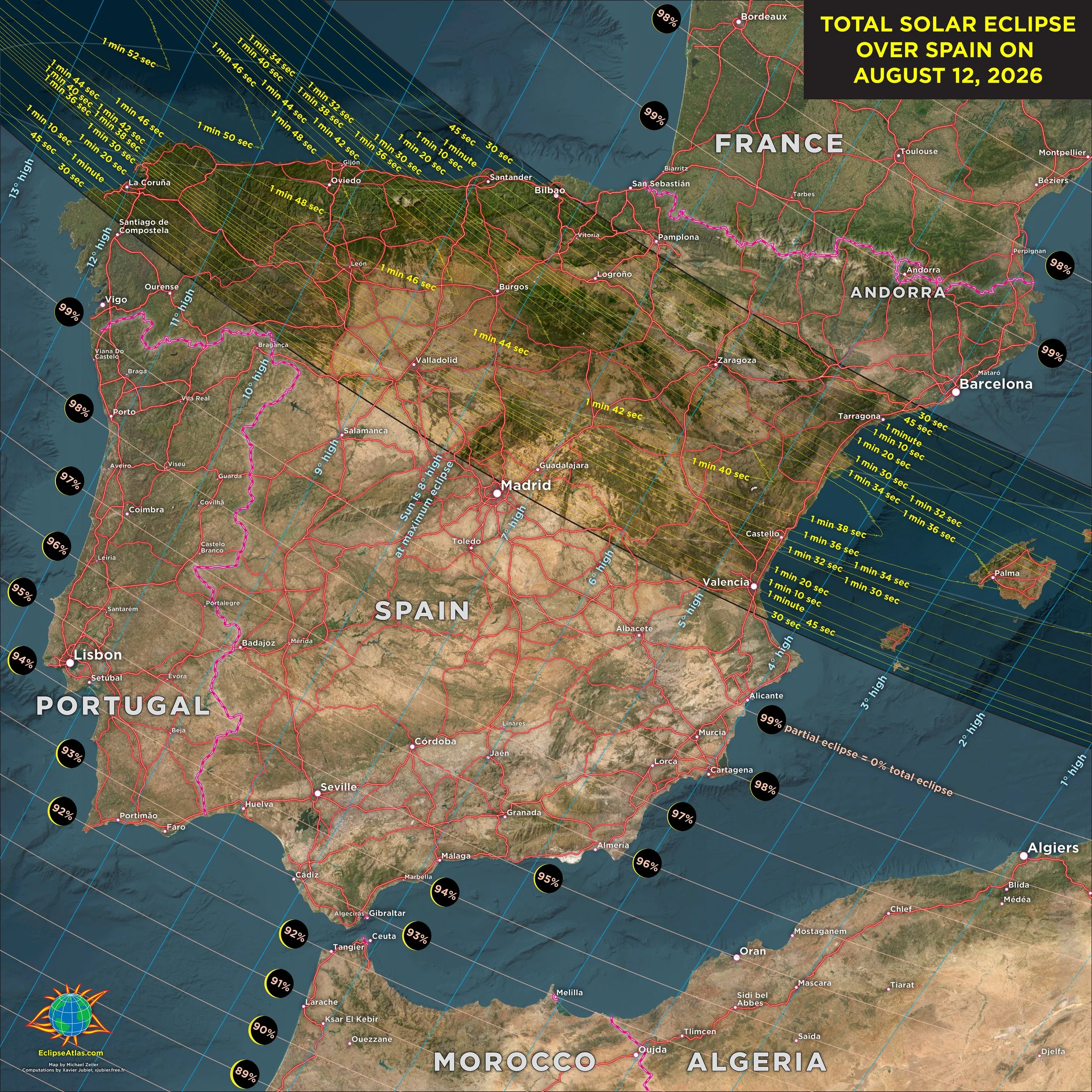 Overview map of the eclipse over Spain From the Atlas of Solar Eclipses - 2020 to 2045 by Michael Zeiler and Michael Bakich