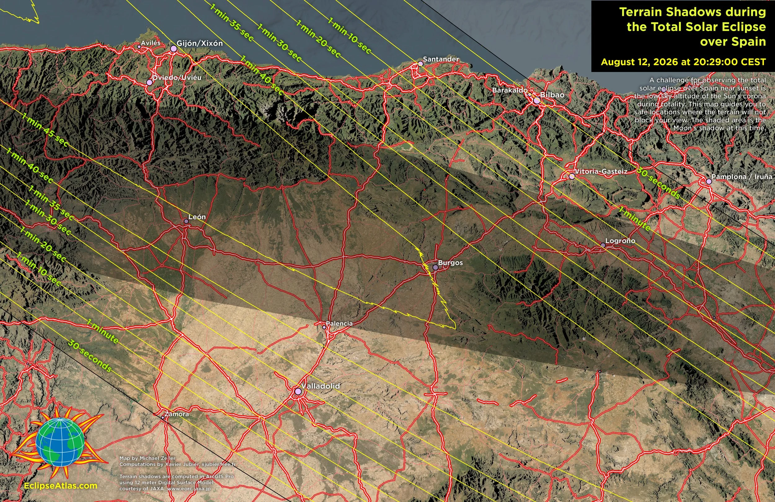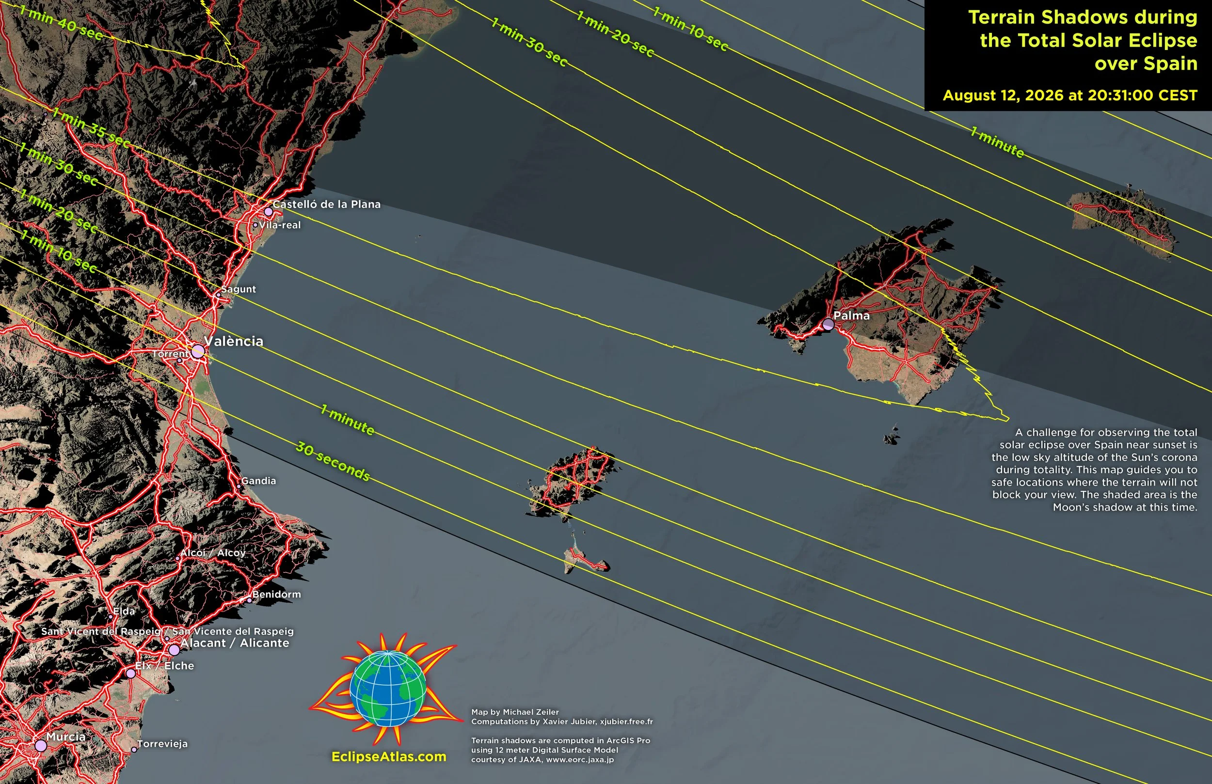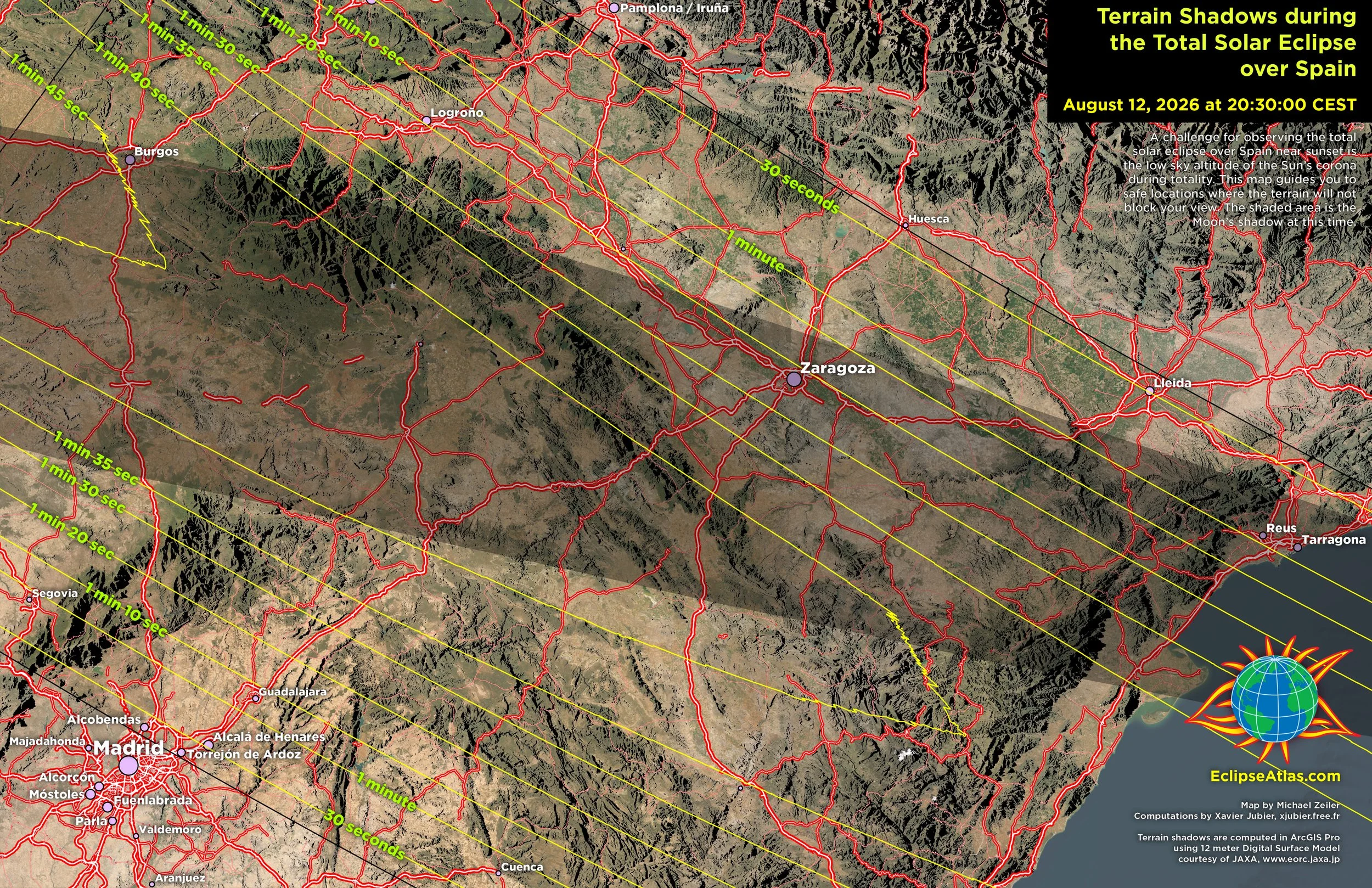 A special challenge for the eclipse in Spain will be the low Sun altitude in the sky during totality. These maps guide you to where you can view the total eclipse without obscuration by the local terrain.