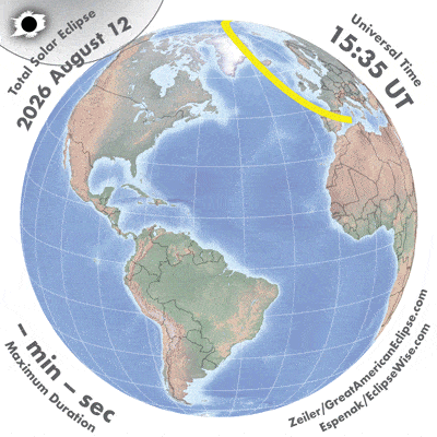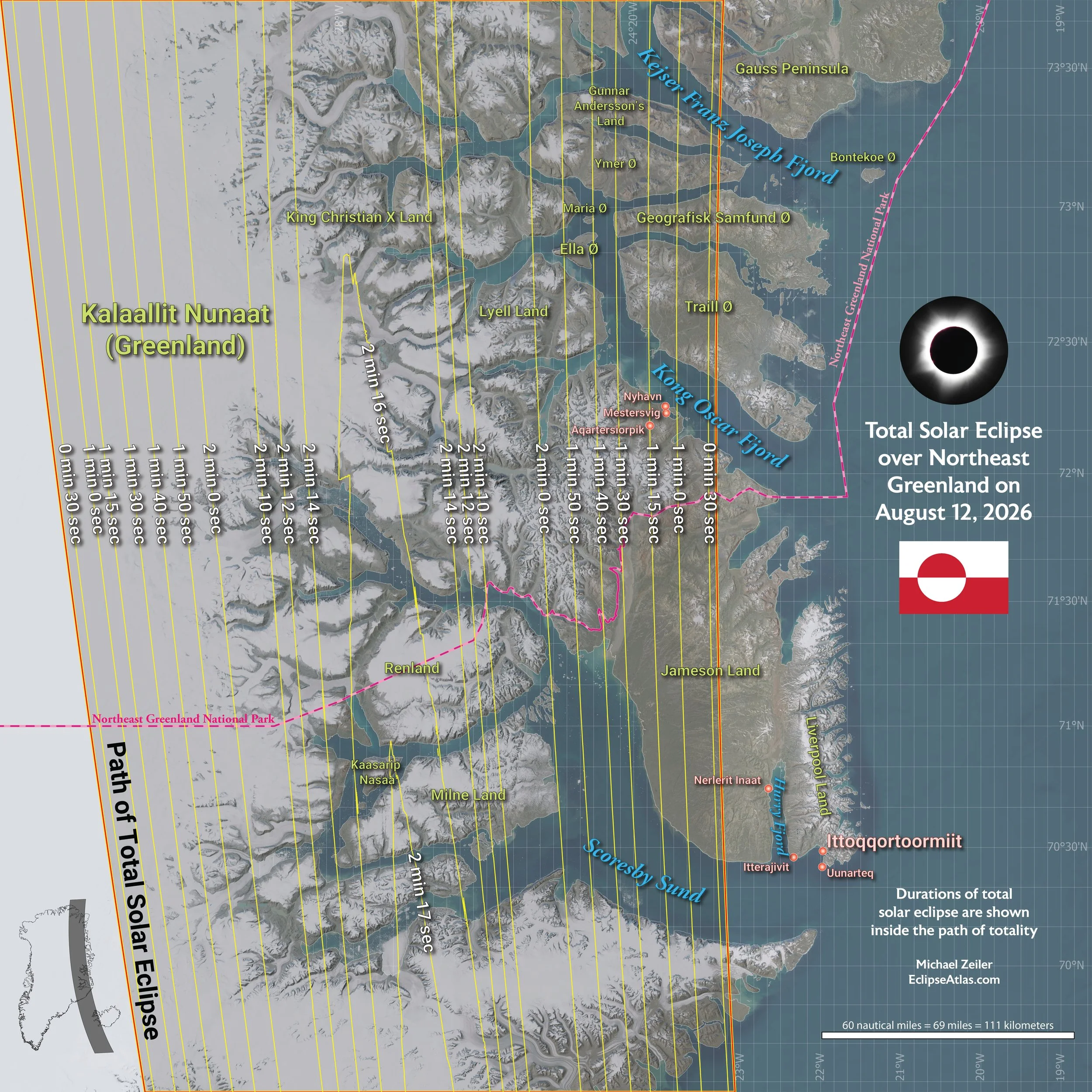 The total eclipse begins at sunrise in a remote area of northern Siberia. The path of totality sweeps over the Arctic icecap, coming within just one degree of the North Pole. The first landfall at Greenland comes at its northernmost tip and then crosses the Northeast Greenland National Park. The largest fjord in the world, Scoresby Sund, experiences up to 2 minutes and 16 seconds of totality. After crossing the Denmark Strait, totality covers western Iceland, including the capital Reykjavík. Shortly before ending at sunset, the total eclipse crosses northern Spain with a maximum duration of 1 minute and 49 seconds. The last landfall of totality is the Balearic Islands of Spain.