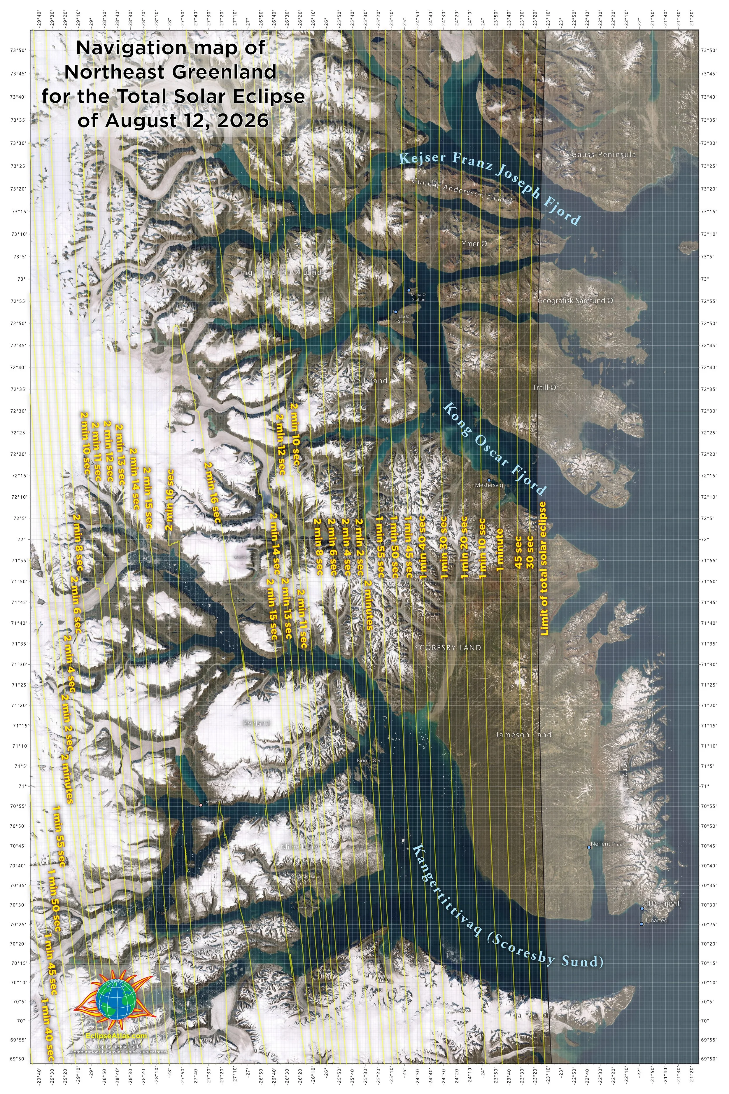 The fjords of northeast Greenland will be the focus of eclipse expedition ships because of the magnificent scenery and a favorable micro-climate for clear skies on eclipse day.